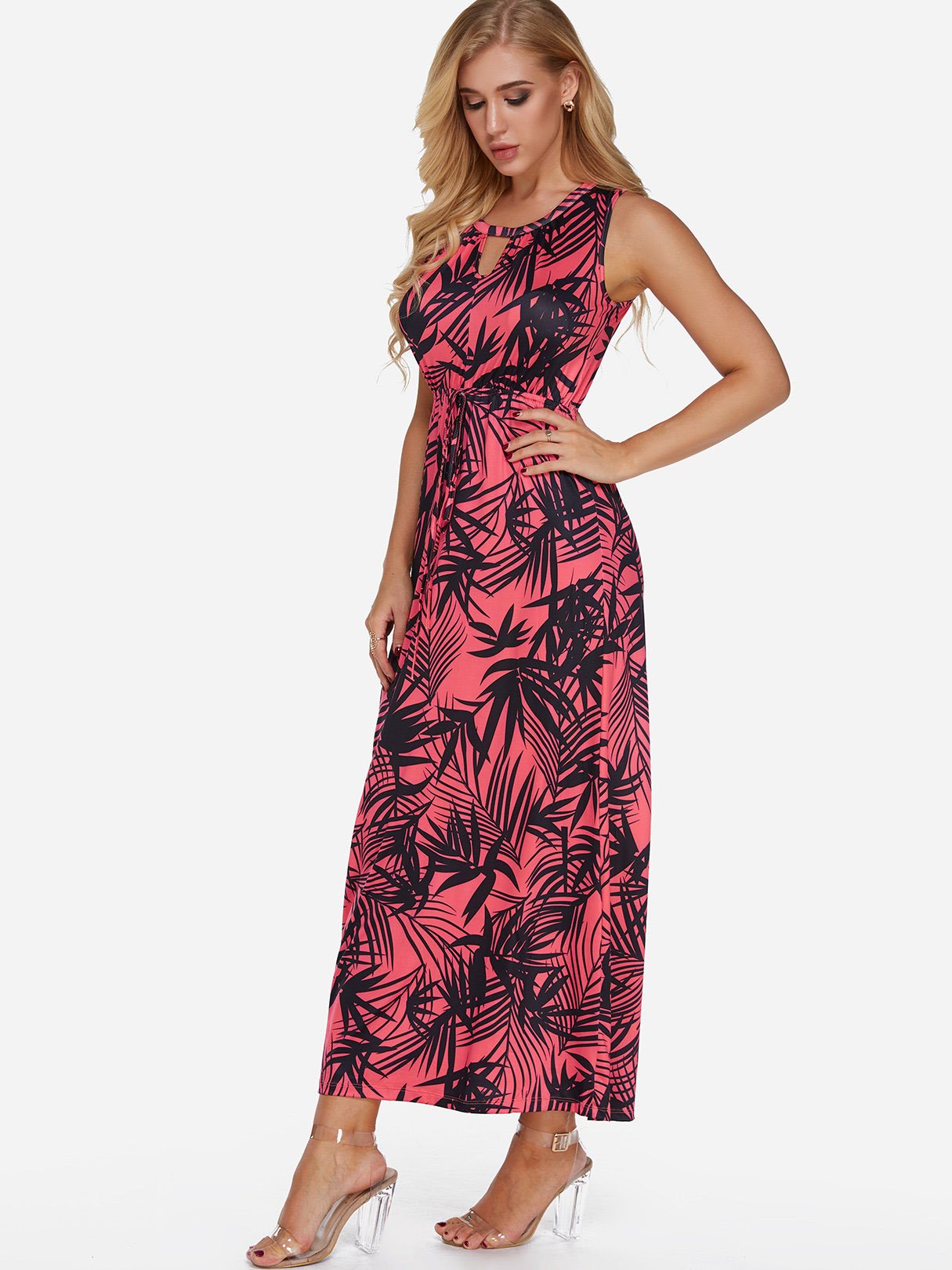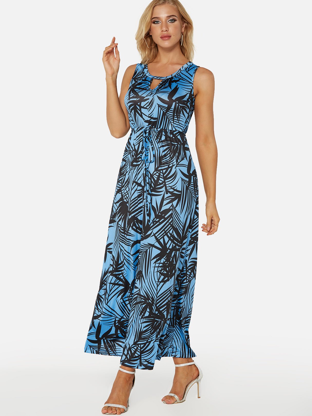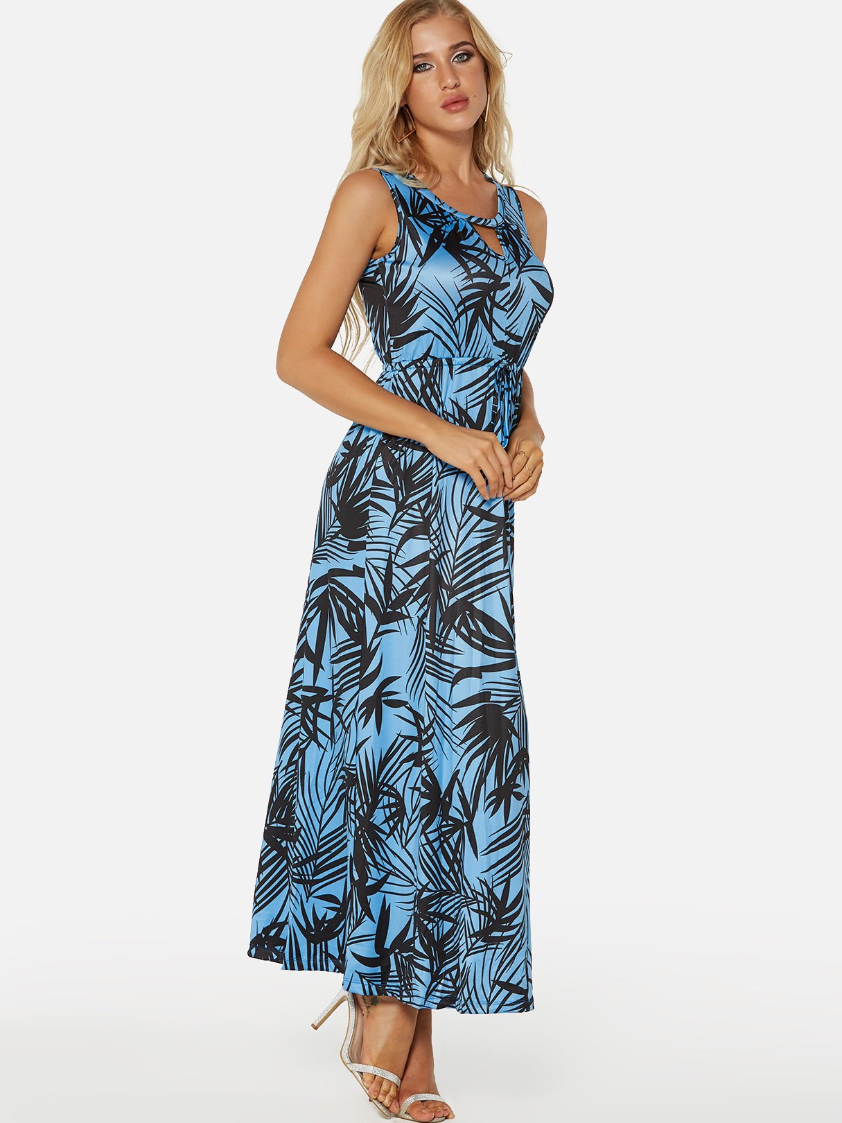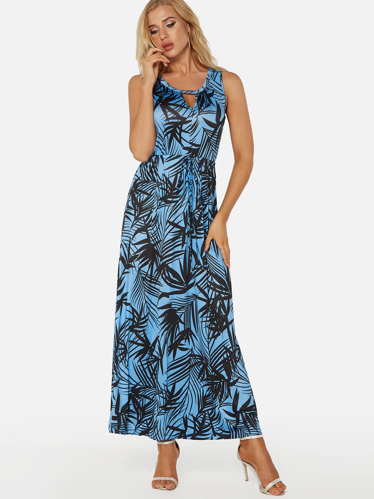 Round Neck Sleeveless Floral Print Lace-Up Cut Out Maxi Dress