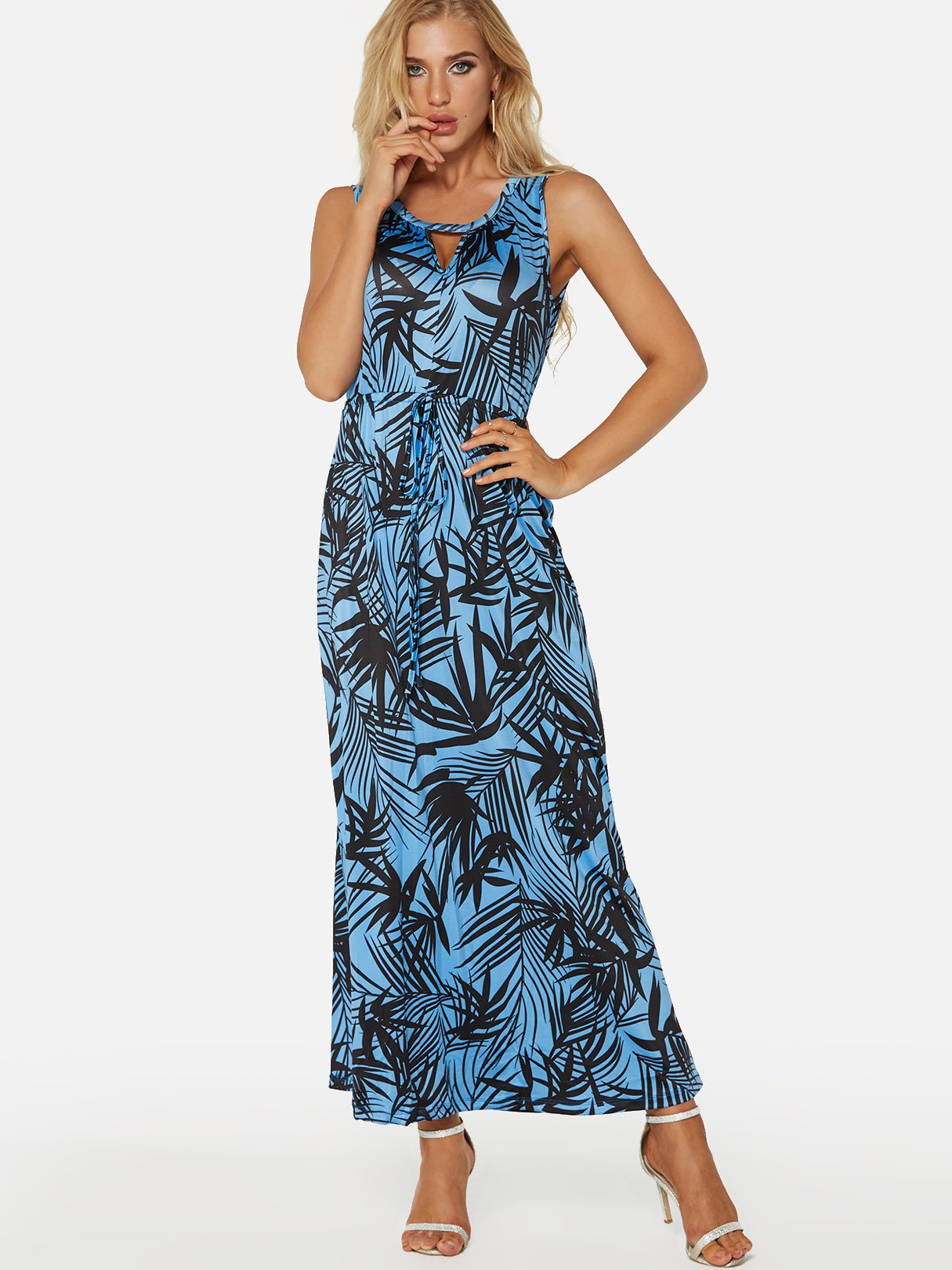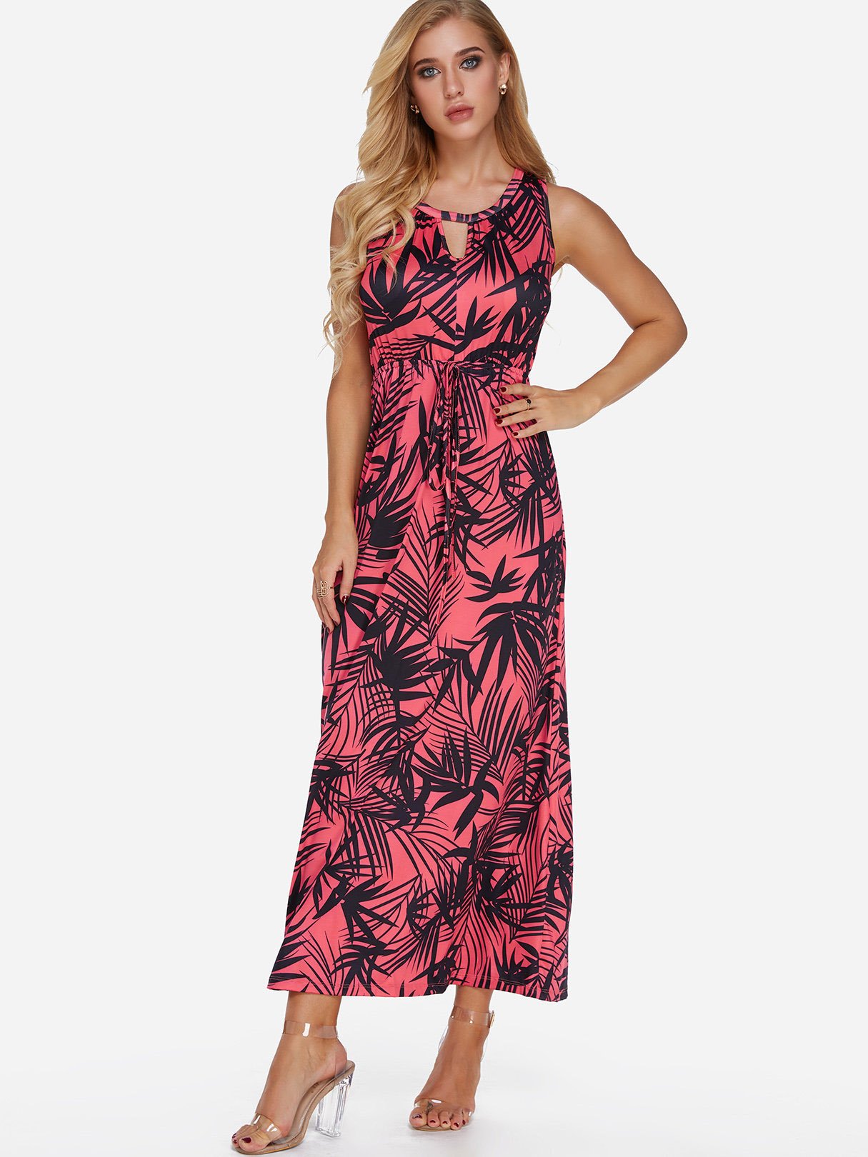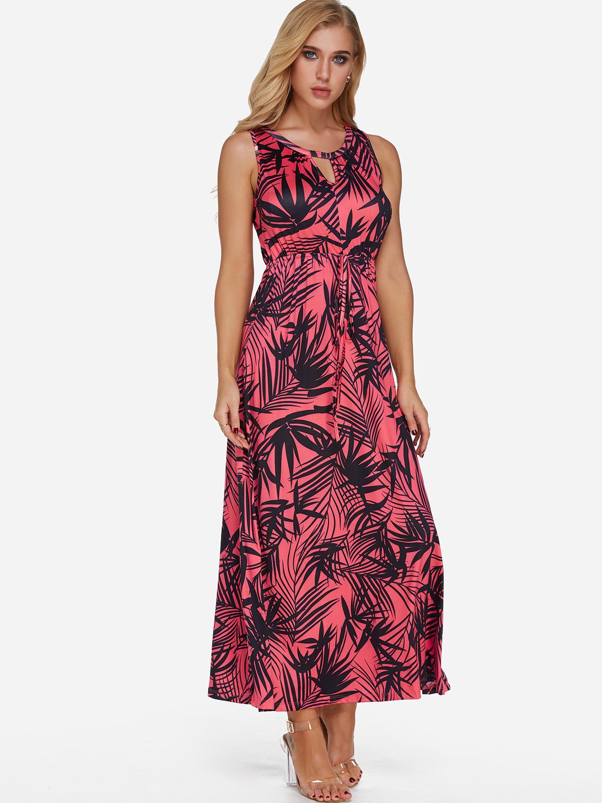 Round Neck Sleeveless Floral Print Lace-Up Cut Out Maxi Dress