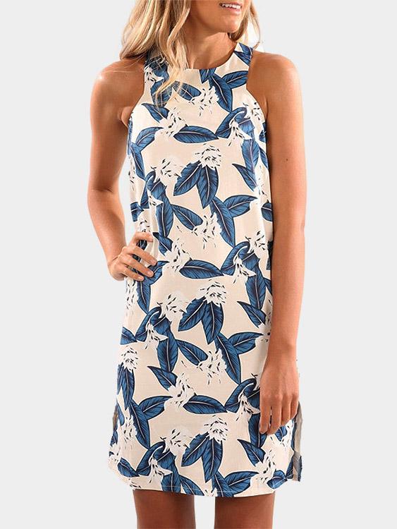 Round Neck Sleeveless Floral Print Slit Sexy Dresses