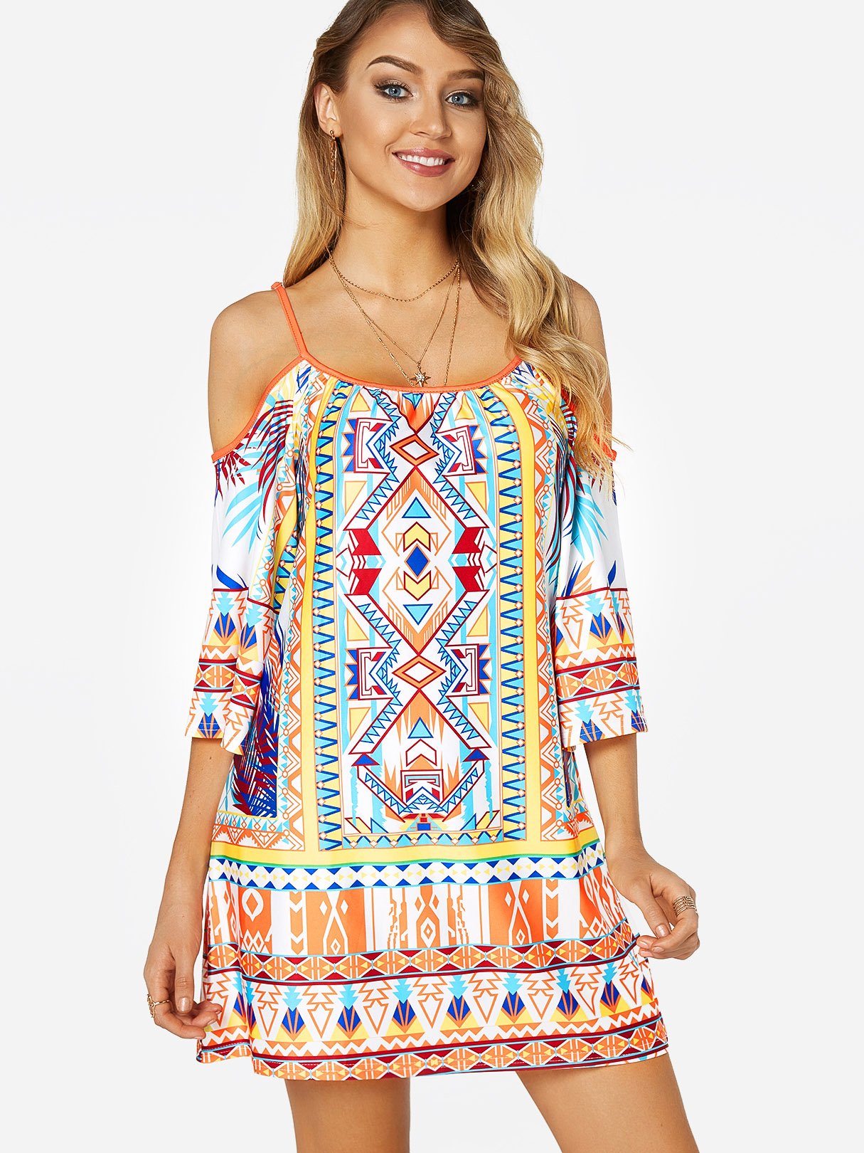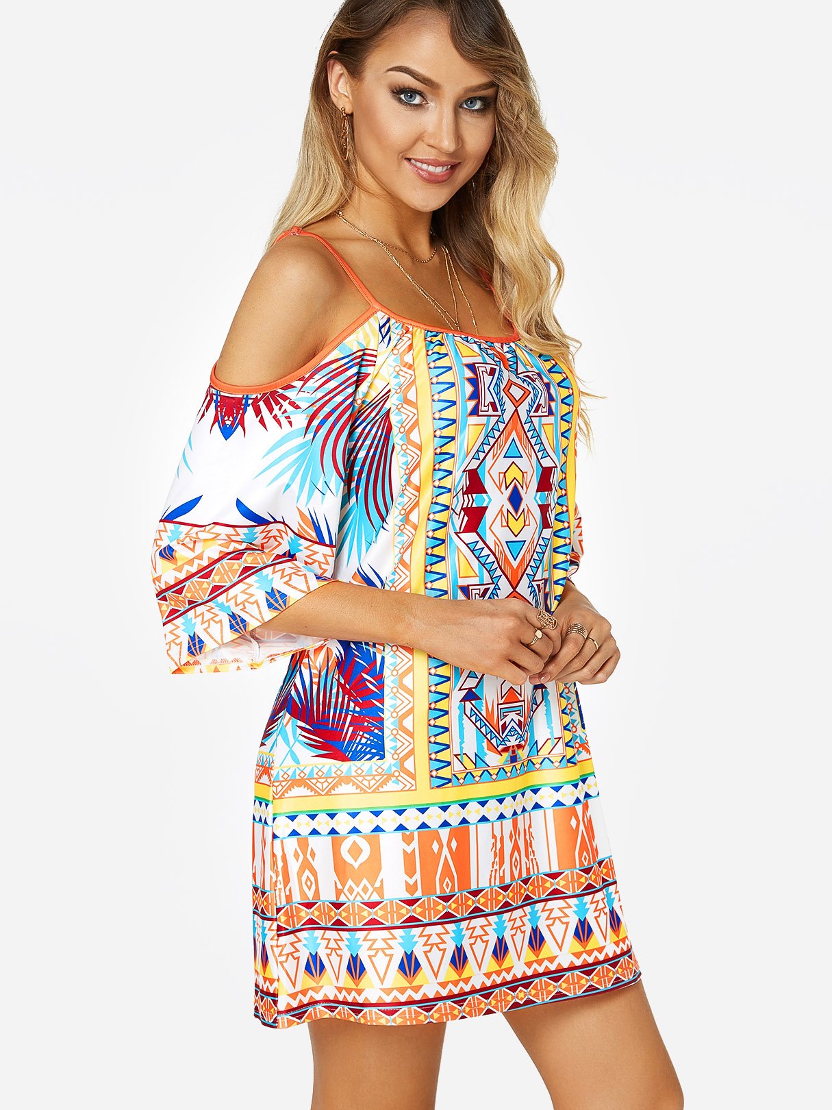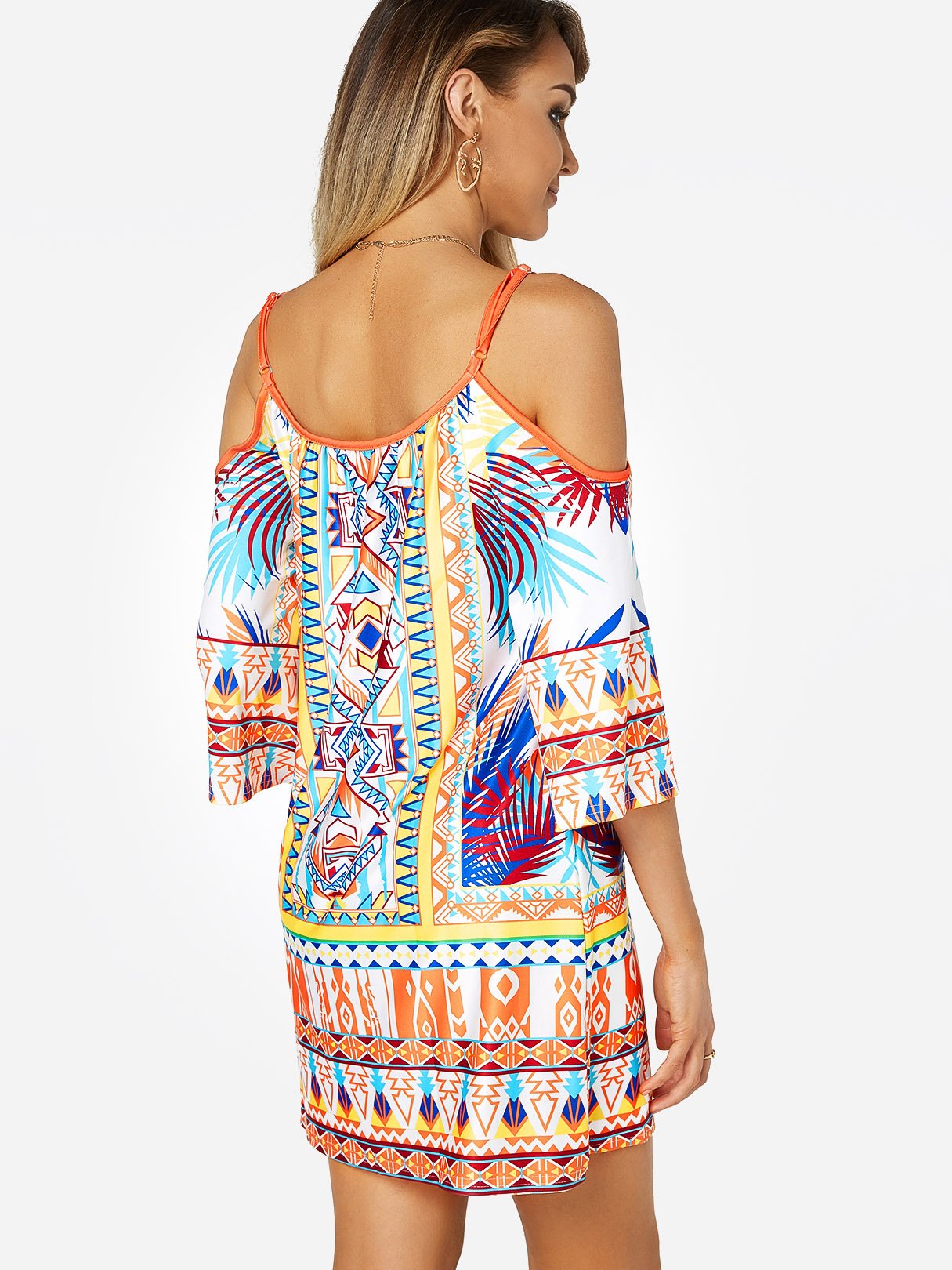 Scoop Neck Cold Shoulder Half Sleeve Floral Print Backless Spaghetti Strap Dresses