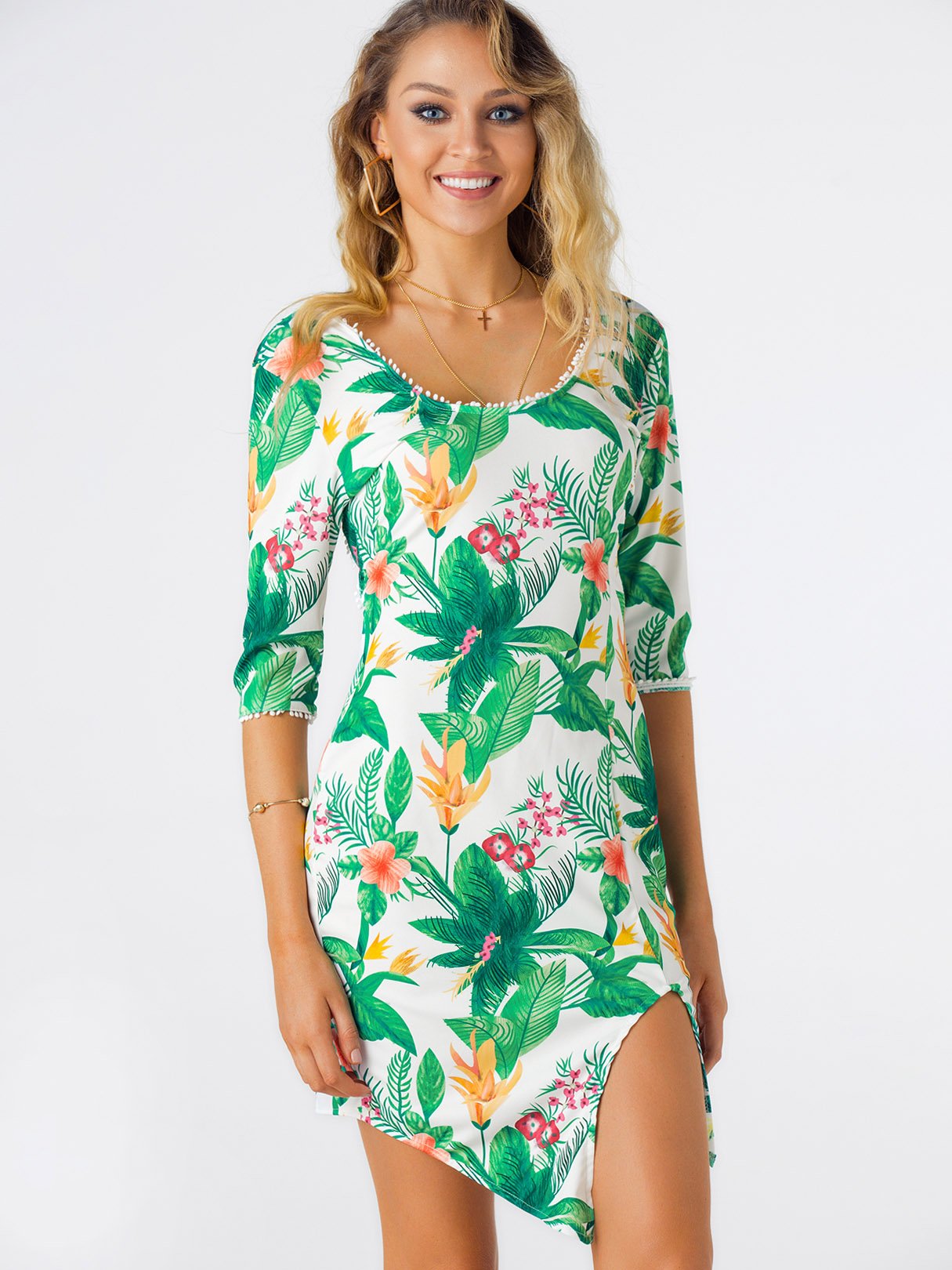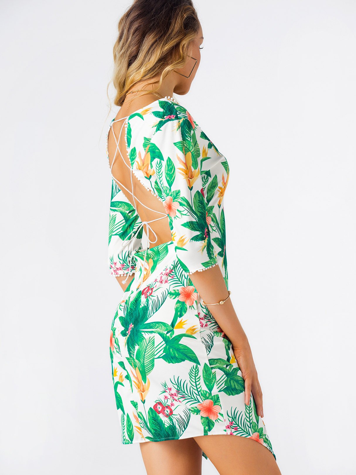 Scoop Neck Half Sleeve Floral Print Backless Lace-Up Slit Irregular Hem Dress