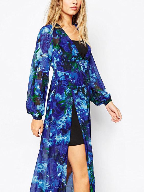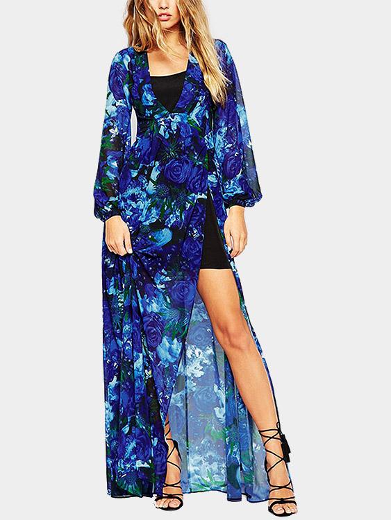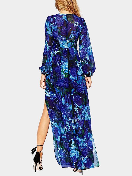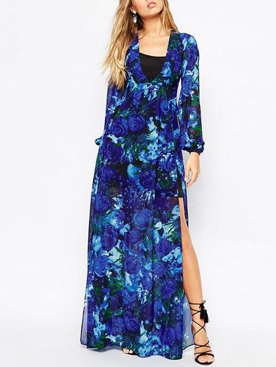 Material:PolyesterNeckline:V-NeckSeason:Spring,Summer,AutumnSleeves:Long SleevesPattern:Floral PrintHem Design:Slit HemLength:Maxi