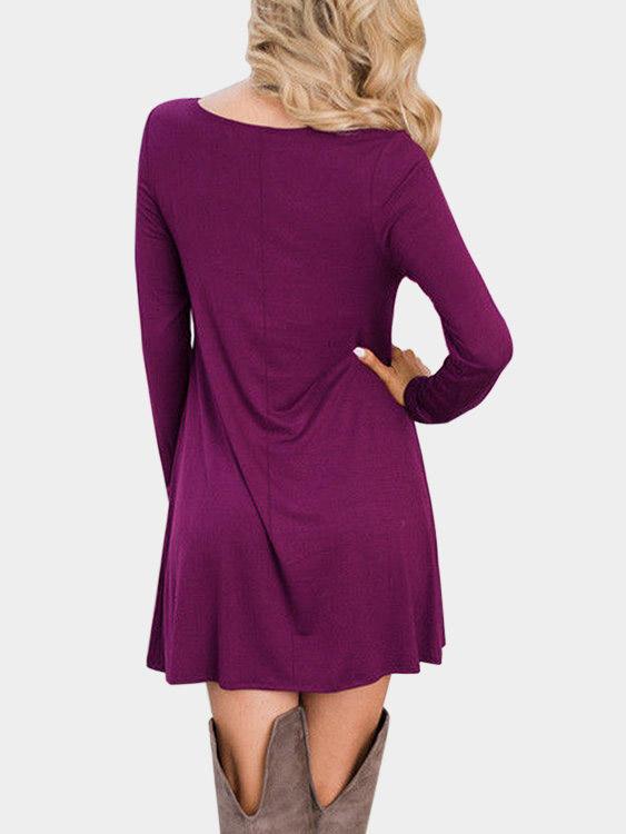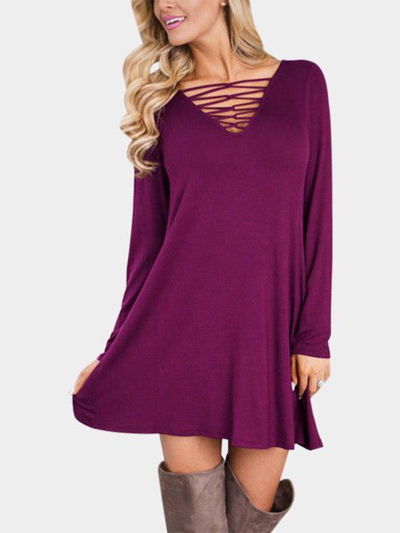 V-Neck Lace-Up Long Sleeve Purple Dress