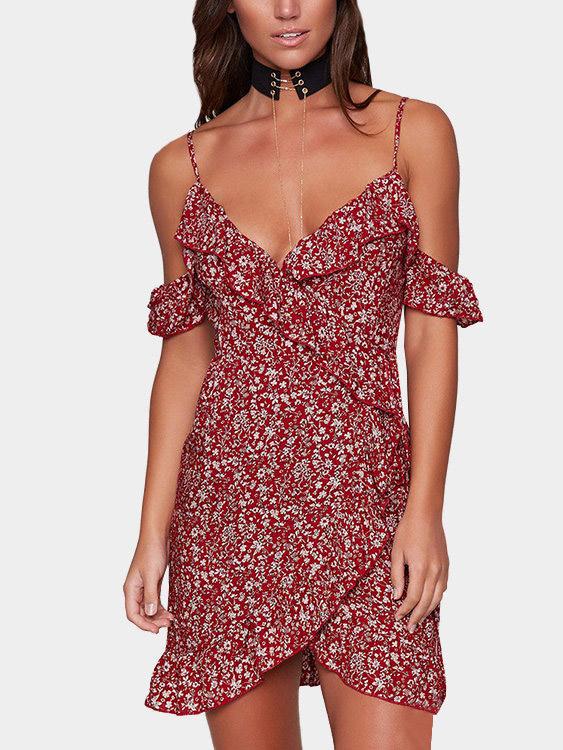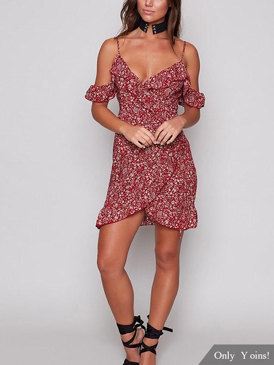 V-Neck Sleeveless Floral Print Backless Ruffle Hem Dresses