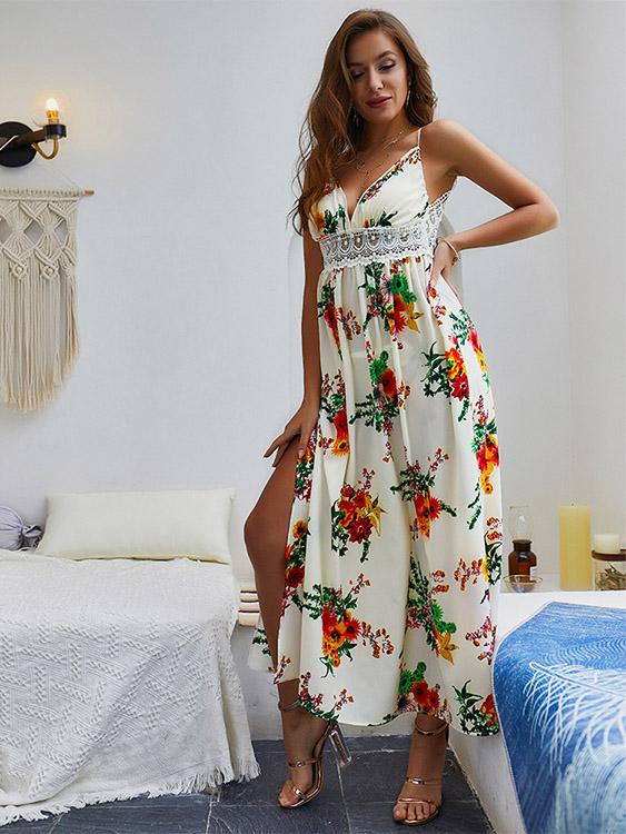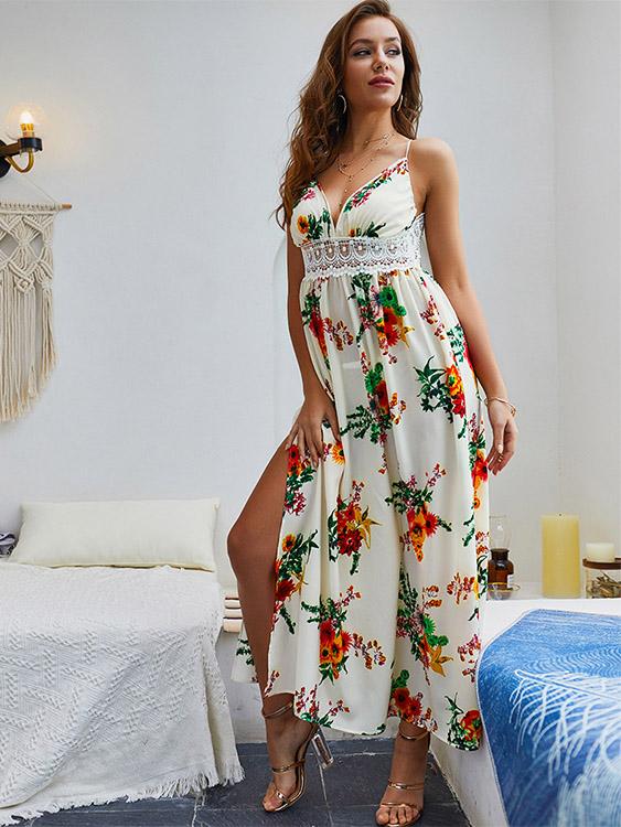Material:PolyesterNeckline:V-NeckSeason:Spring,Summer,AutumnSleeves:SleevelessPattern:Floral PrintStyle:Casual Style,Vacation StyleDetail:Lace,Backless Design,Spaghetti StrapWaist Design:High-WaistedHem Design:Slit HemLength:MaxiFit:Loose FitOccasion:Vacation