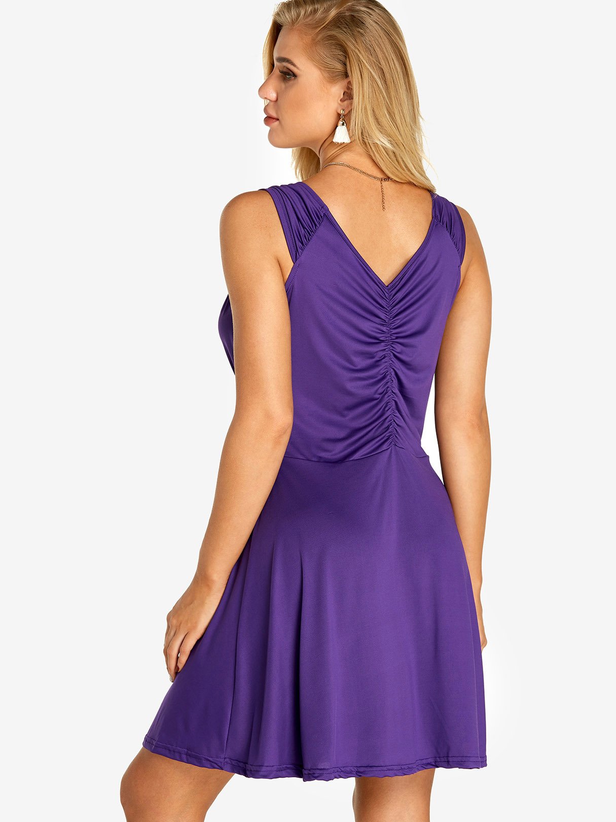 V-Neck Sleeveless Plain Crossed Front Pleated High-Waisted Purple Dresses