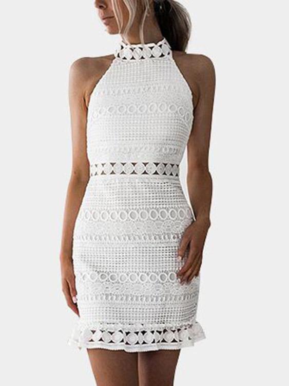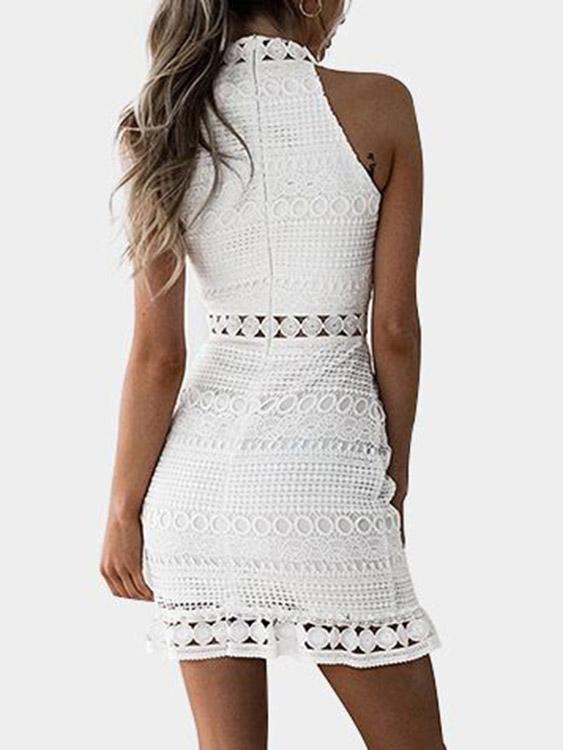 White Crew Neck Sleeveless Plain Lace Zip Back Cut Out Sexy Dress