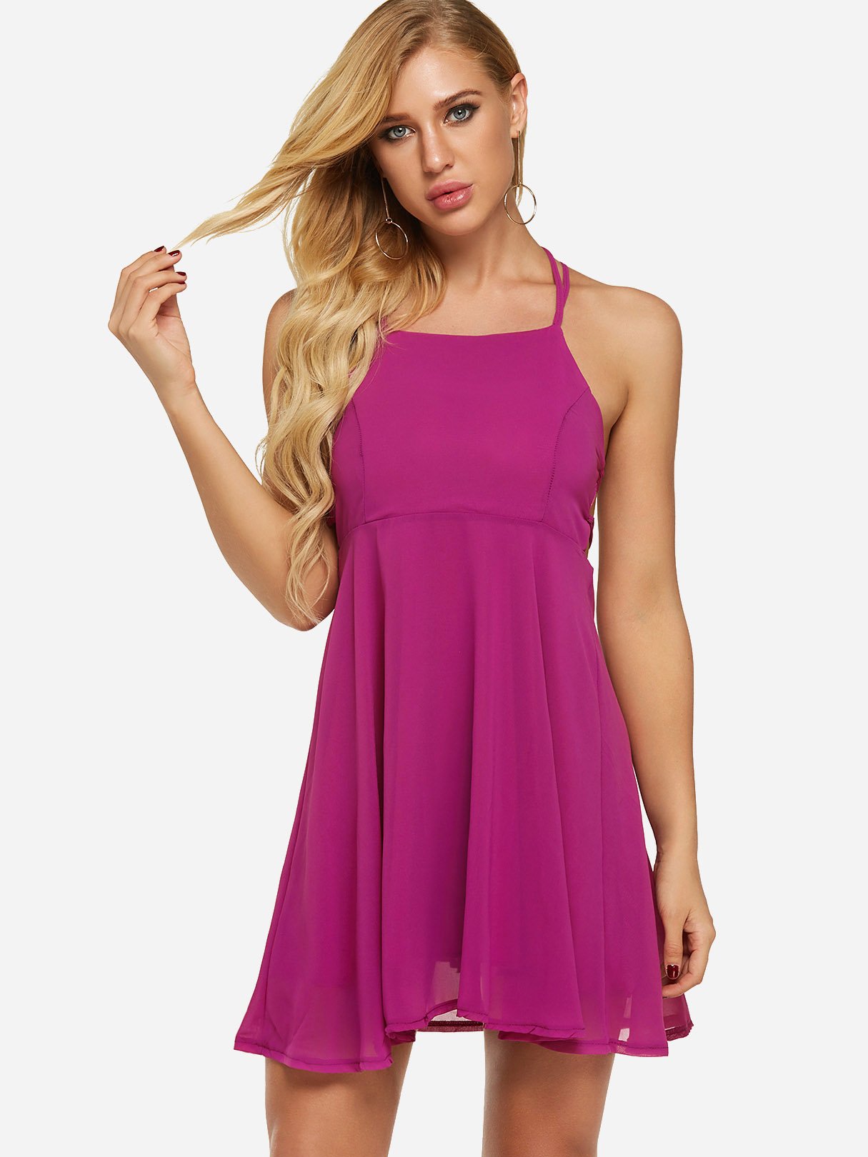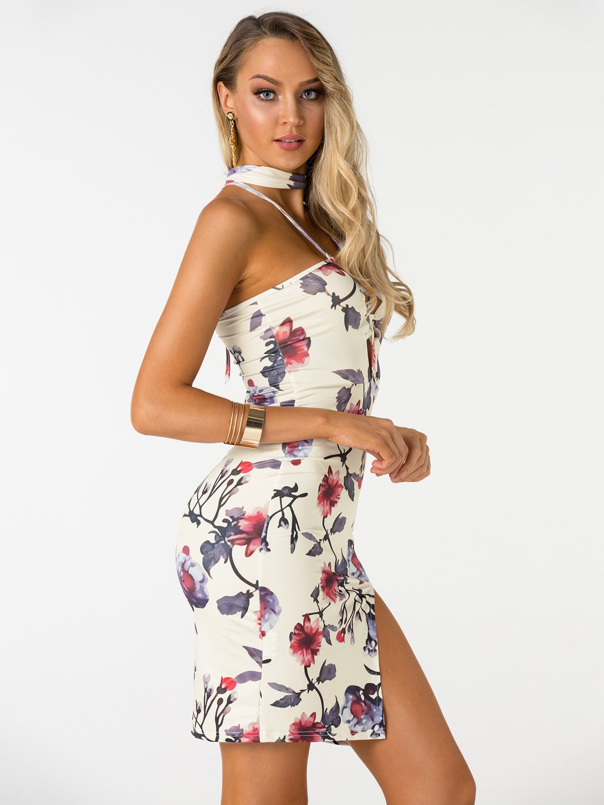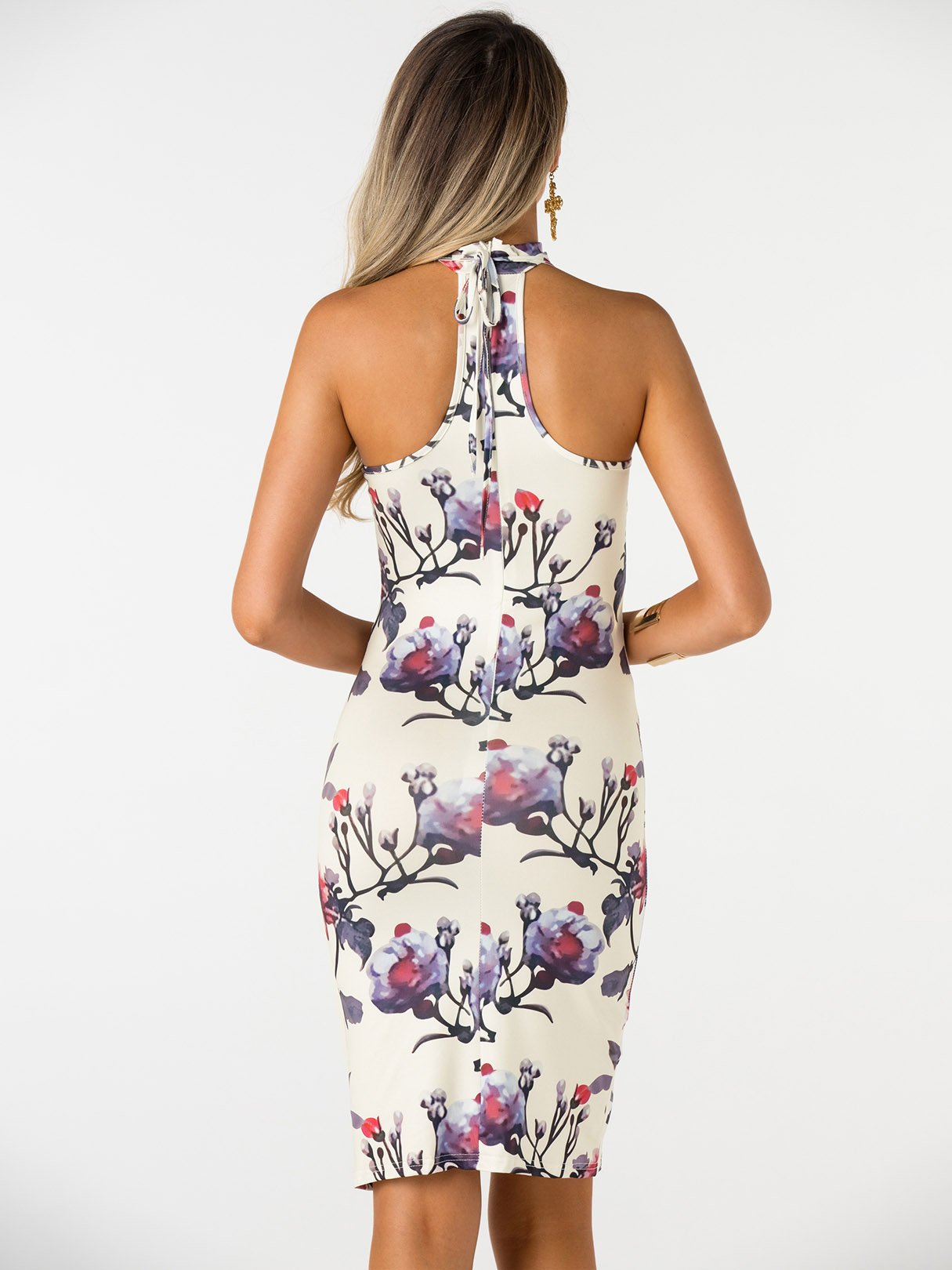White Halter Sleeveless Floral Print Lace-Up Slit Hem Dress