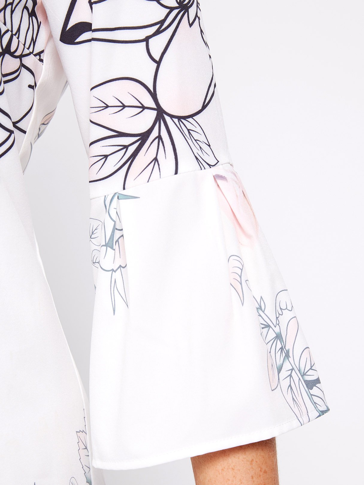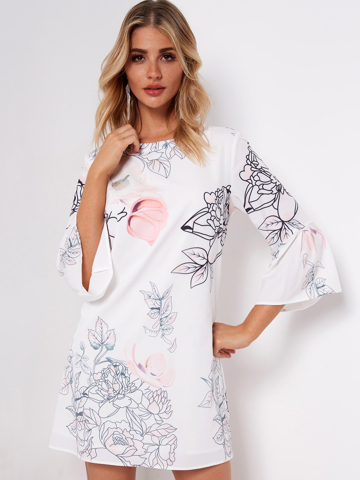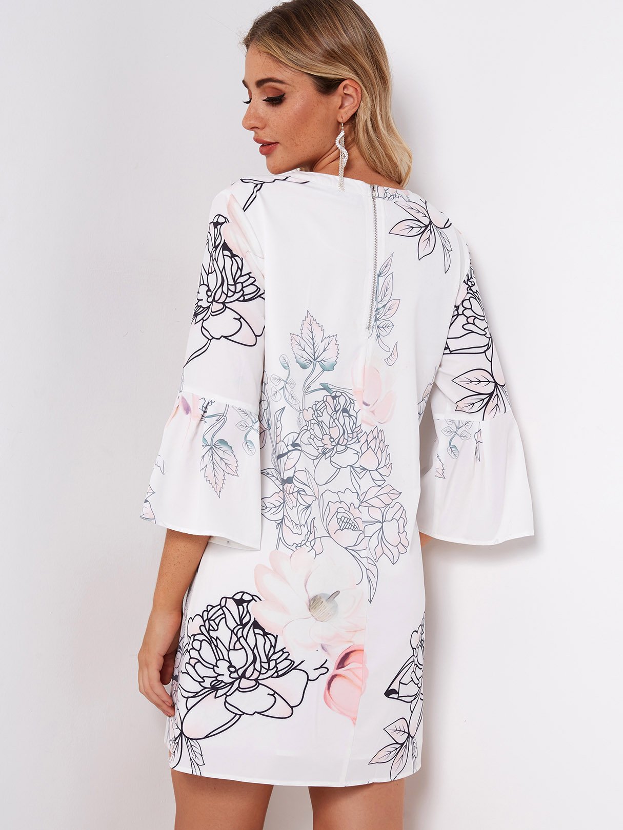 White Round Neck 3/4 Length Sleeve Floral Print Zip Back Dresses