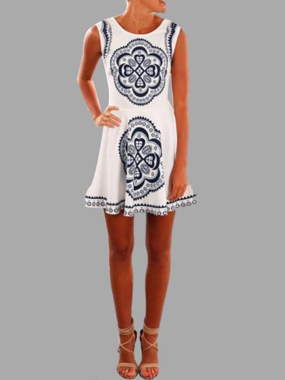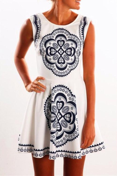 White Sleeveless Floral Print Backless Dresses