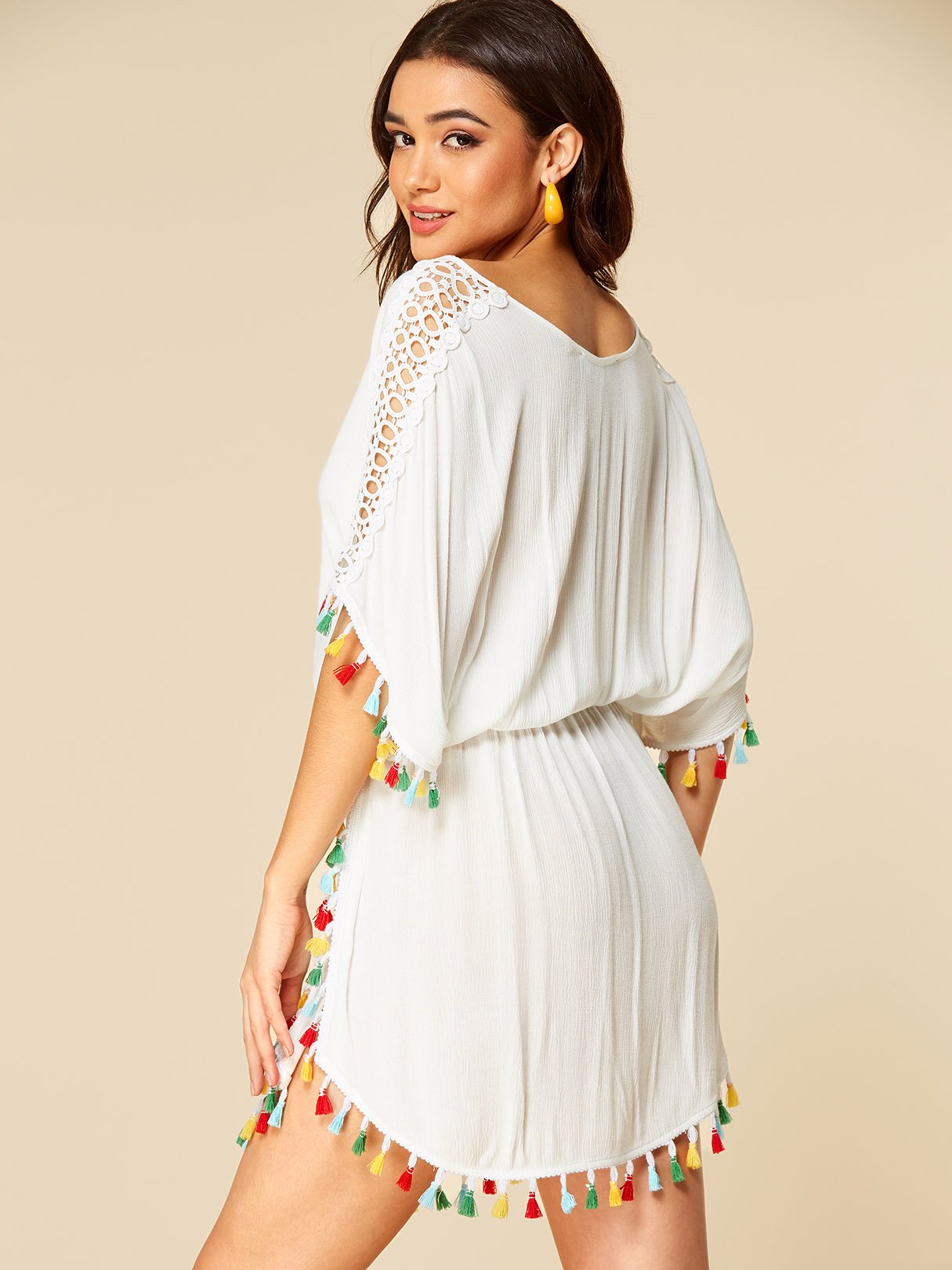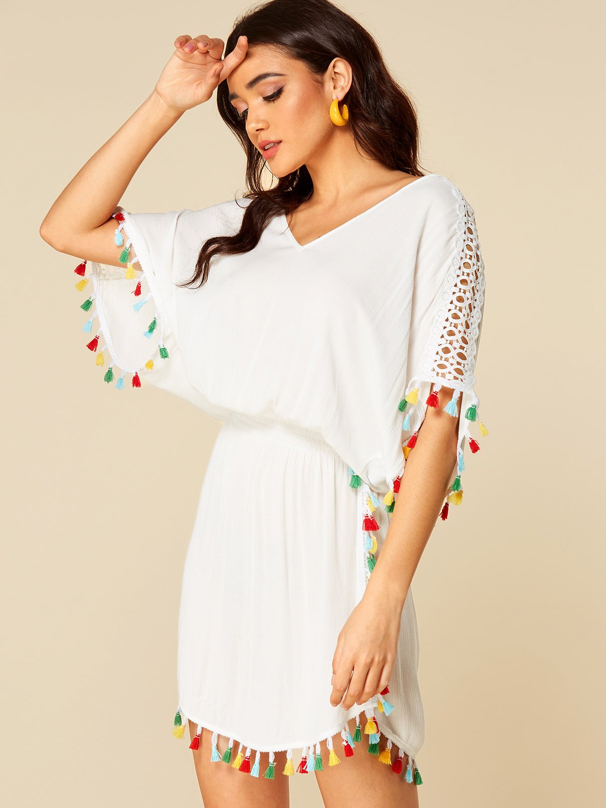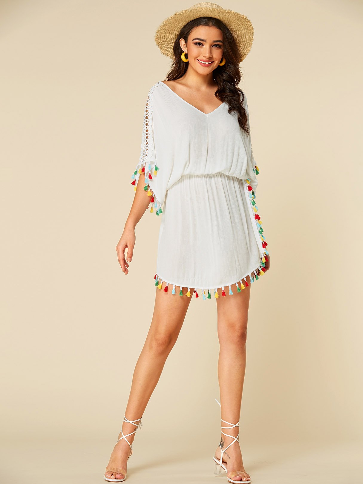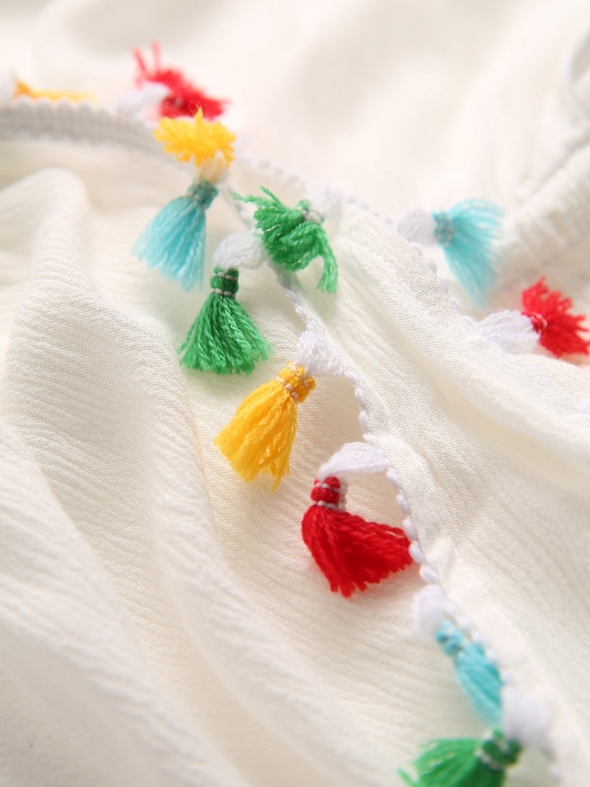 White V-Neck Hollow Pom Pom Hem Dresses