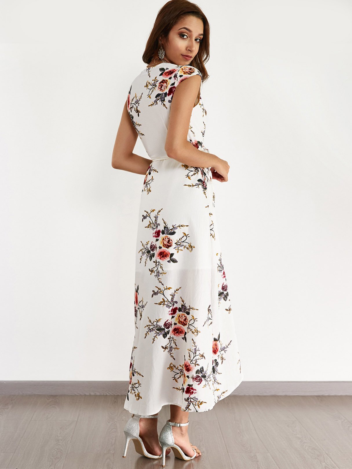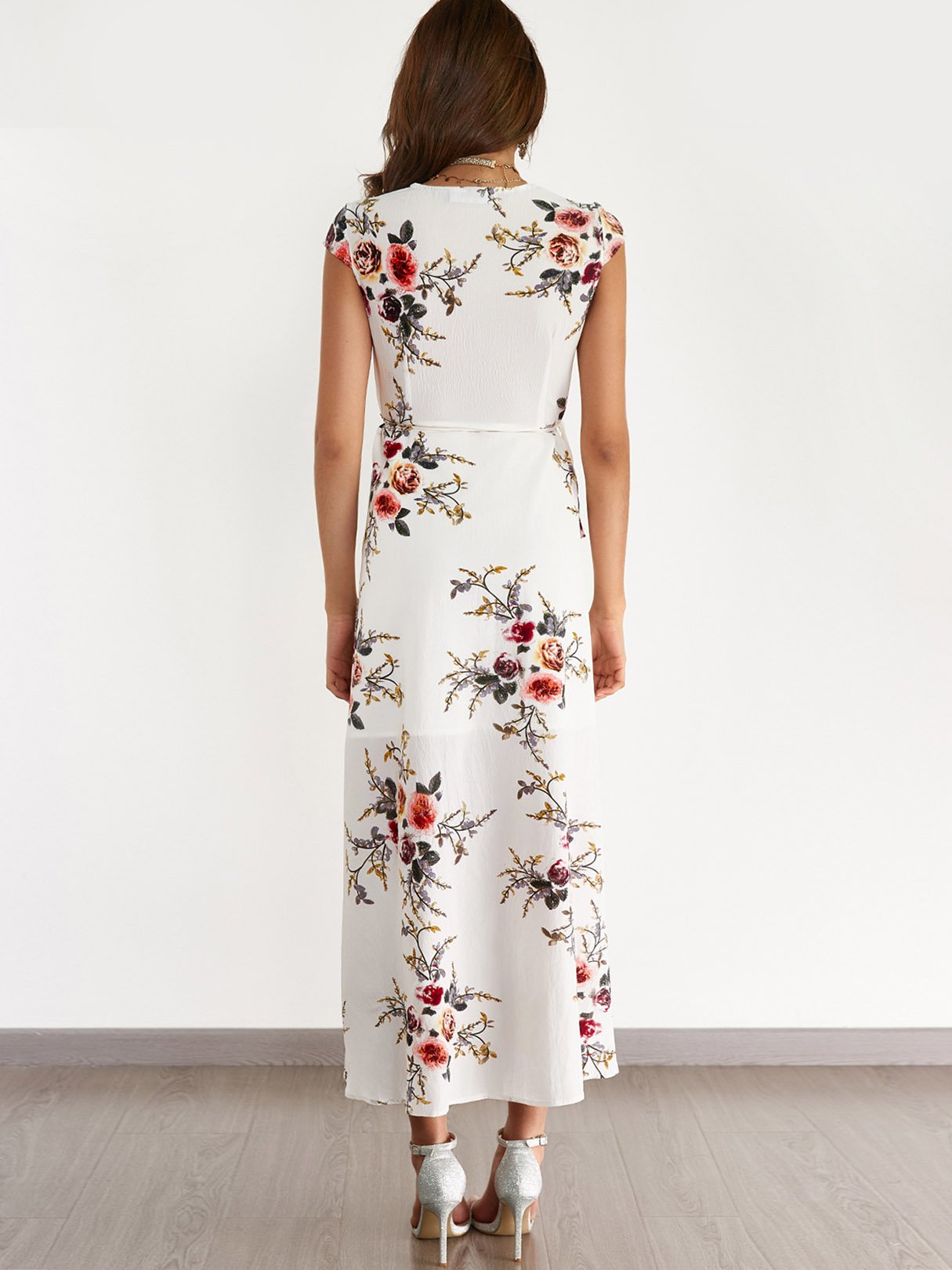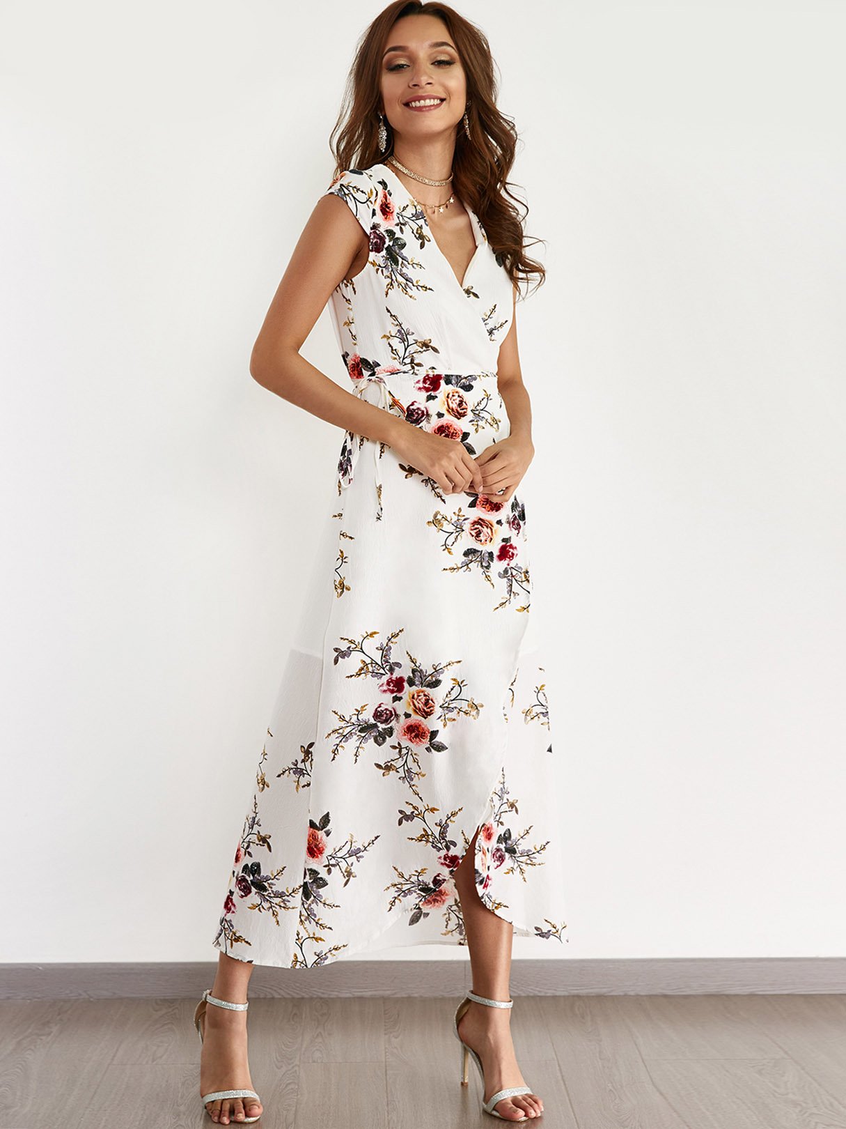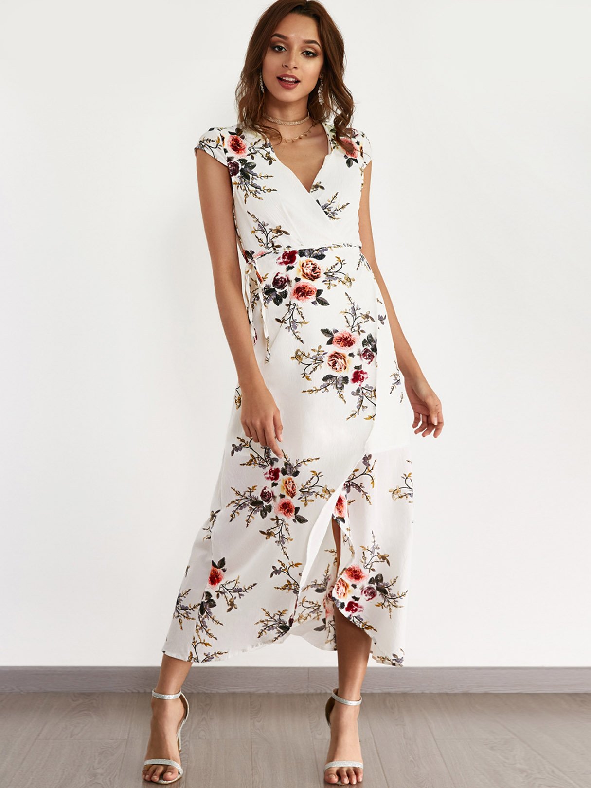 Material:PolyesterNeckline:V-NeckSeason:Spring,Summer,AutumnSleeves:Short SleevesPattern:Floral PrintStyle:Vacation Style,Sexy StyleDetail:Wrap DesignLength:MaxiFit:Regular FitOccasion:Wedding Guest