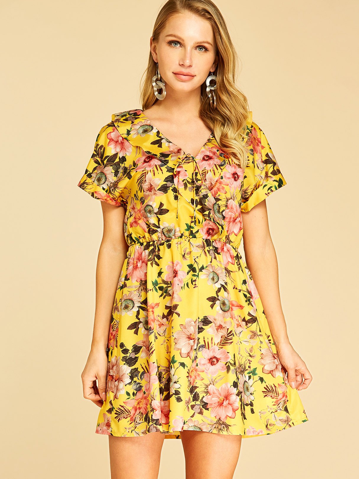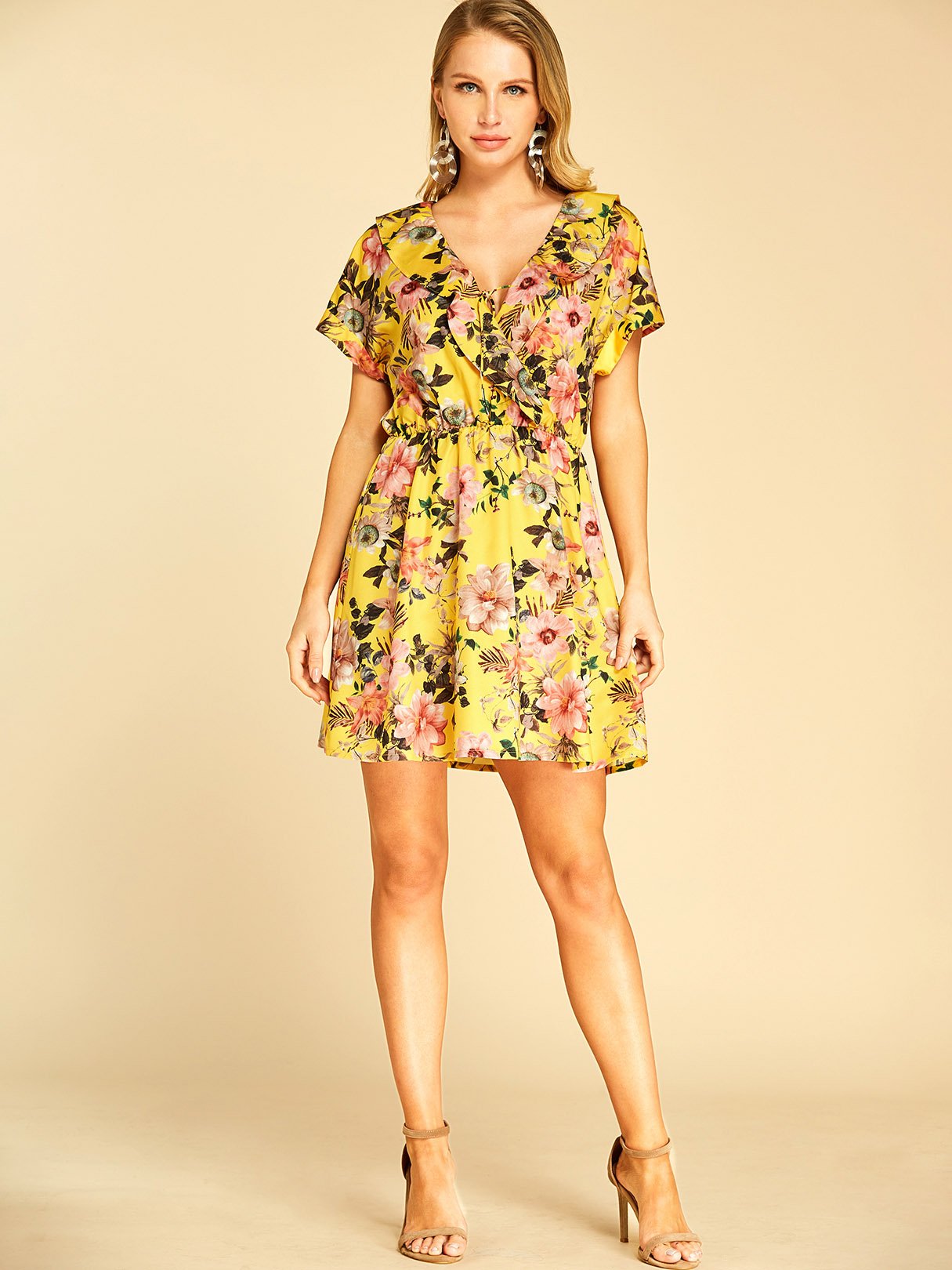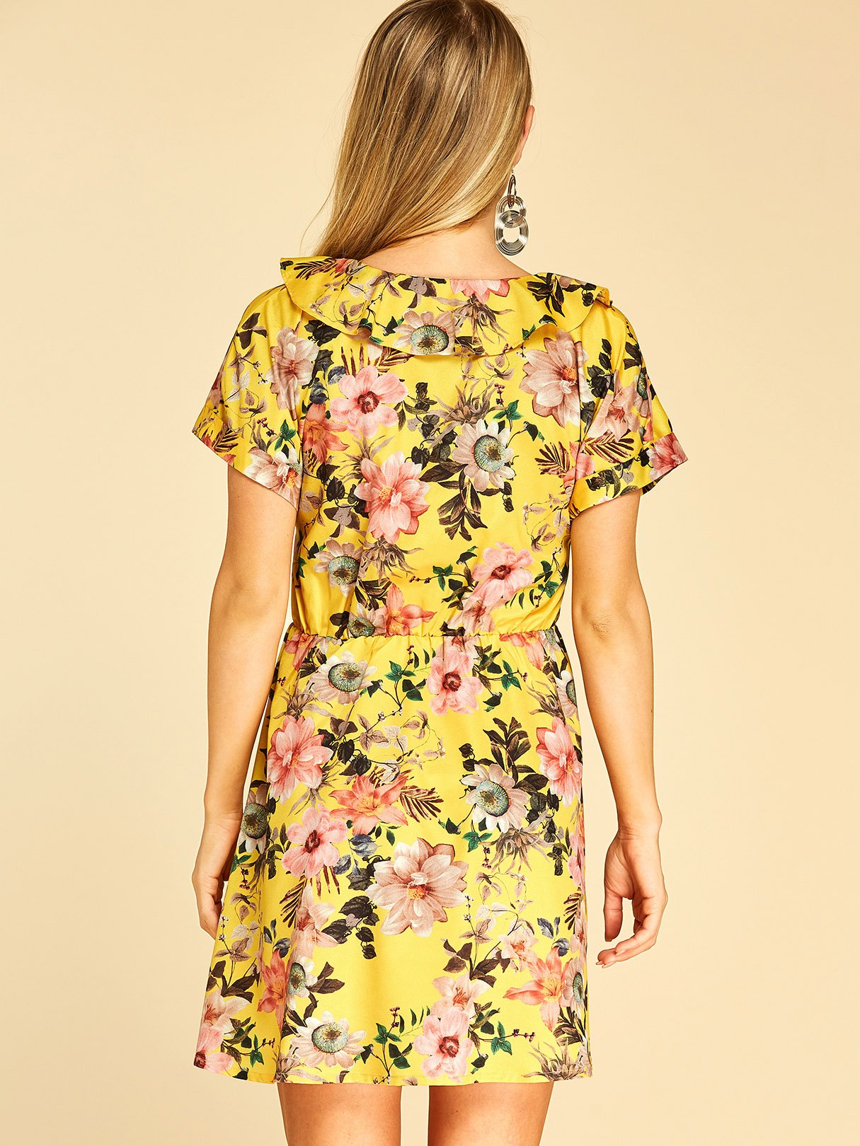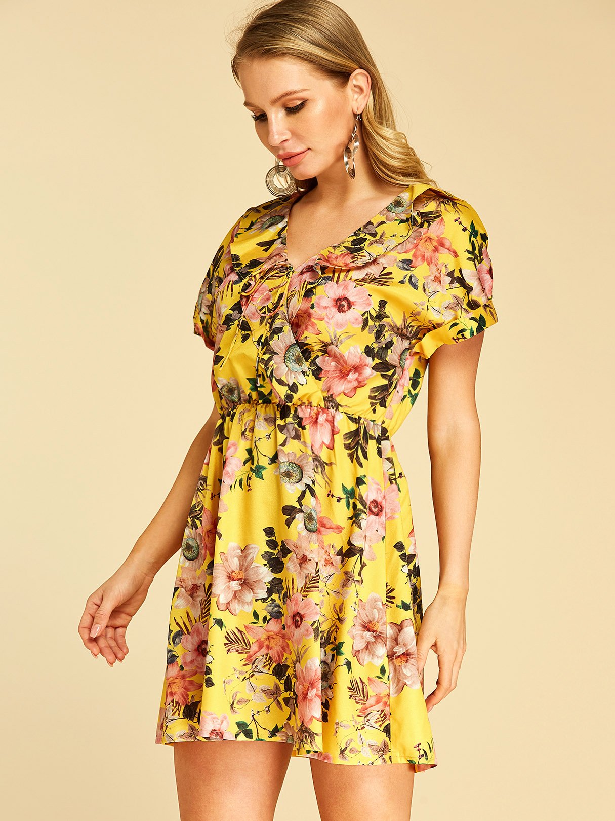 Yellow V-Neck Short Sleeve Floral Print Self-Tie Wrap Dresses