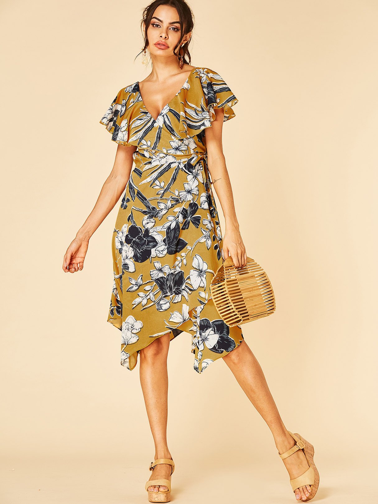 Material:PolyesterNeckline:V-NeckSeason:Spring,SummerSleeves:Short SleevesPattern:Floral PrintStyle:Casual Style,Vacation StyleDetail:Wrap DesignHem Design:Irregular HemLength:MidiFit:Regular FitSleeves Type:Ruffle SleevesOccasion:Vacation