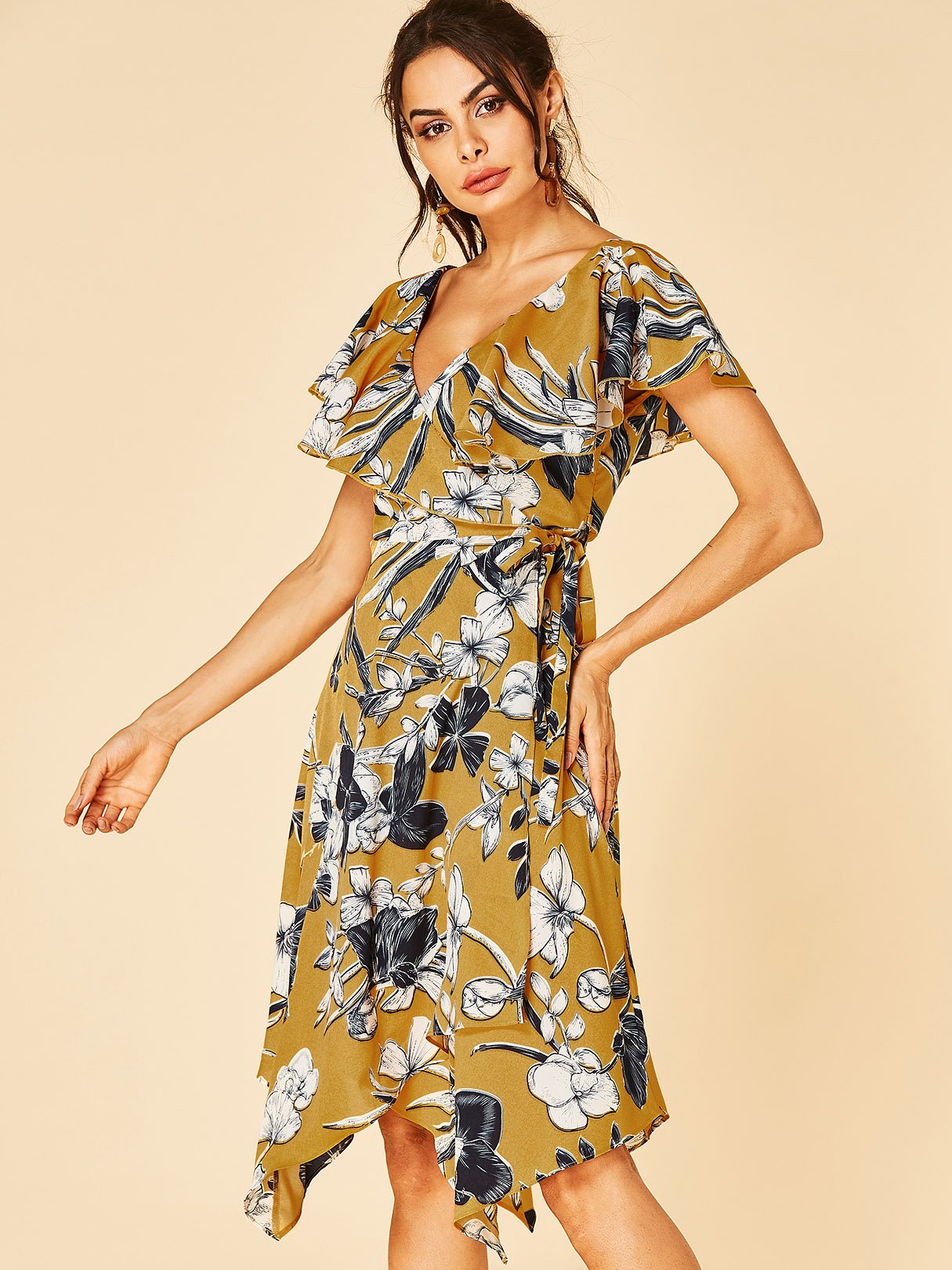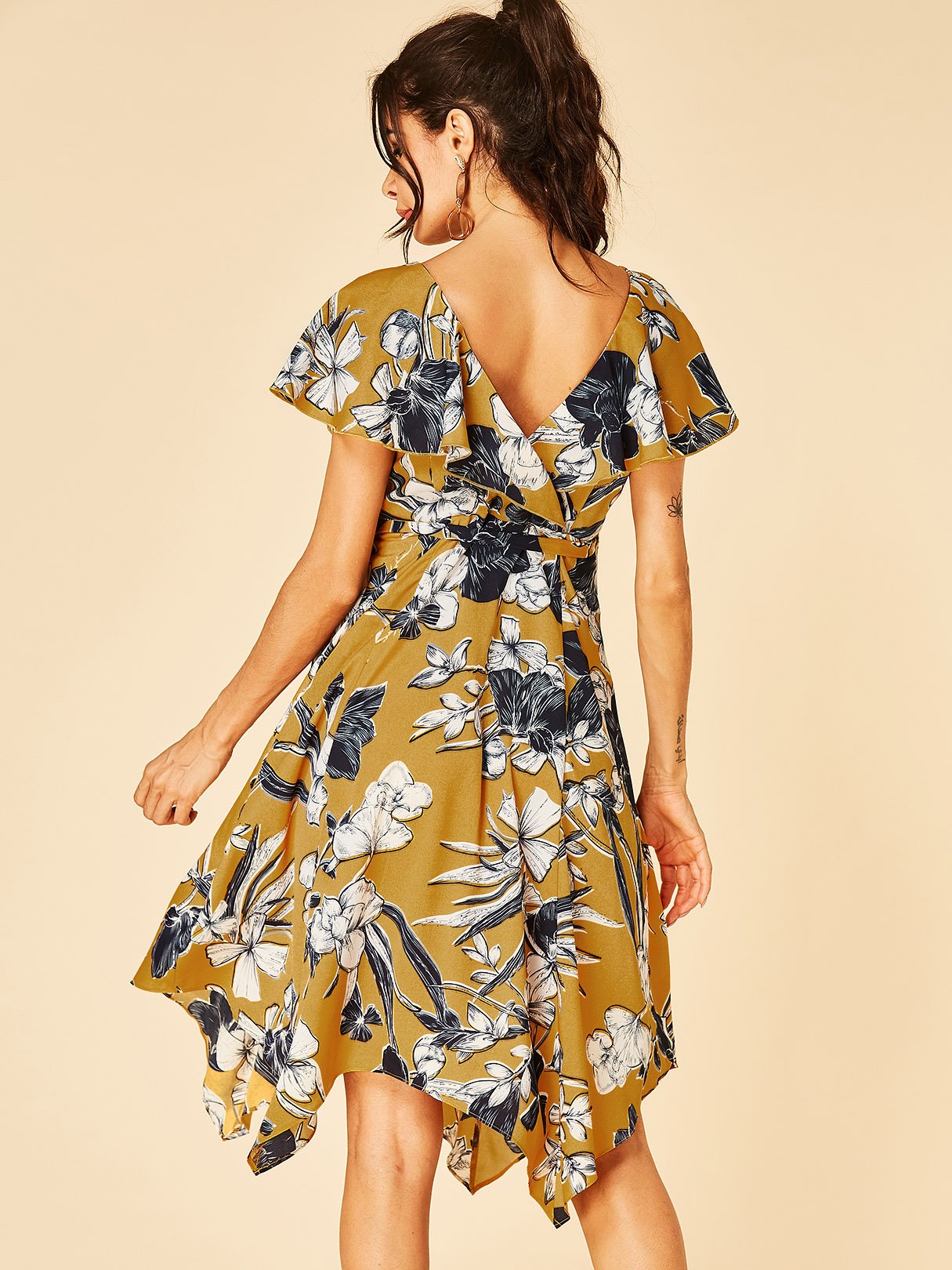 Yellow V-Neck Short Sleeve Floral Print Wrap Irregular Hem Dresses - Yellow / S is backordered and will ship as soon as it is back in stock.