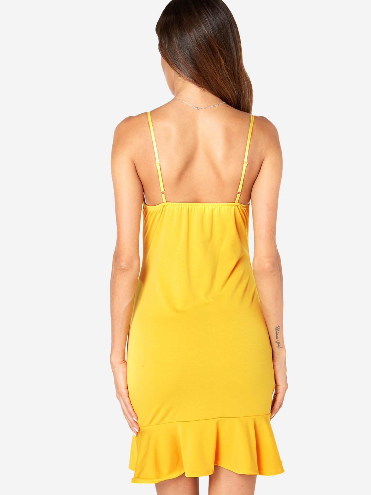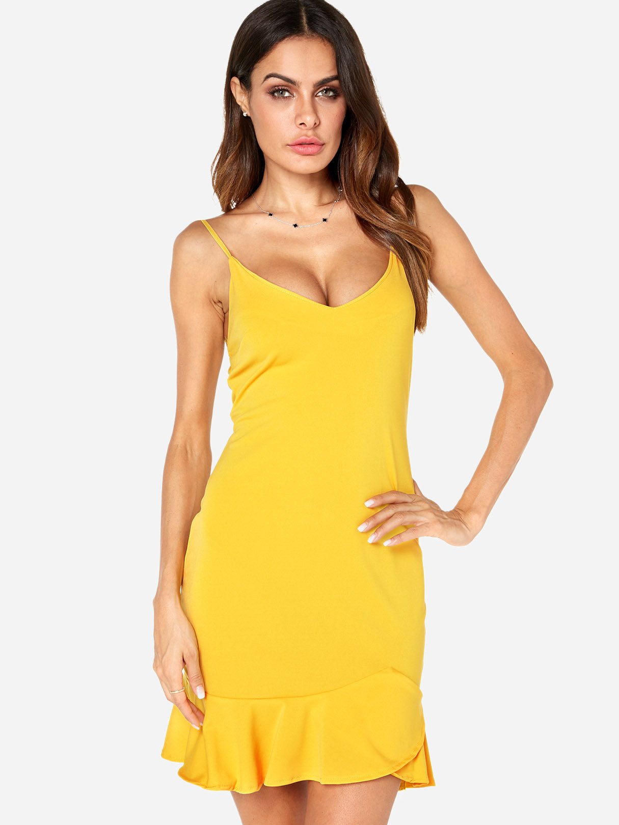 Yellow V-Neck Sleeveless Plain Flounced Hem Dresses