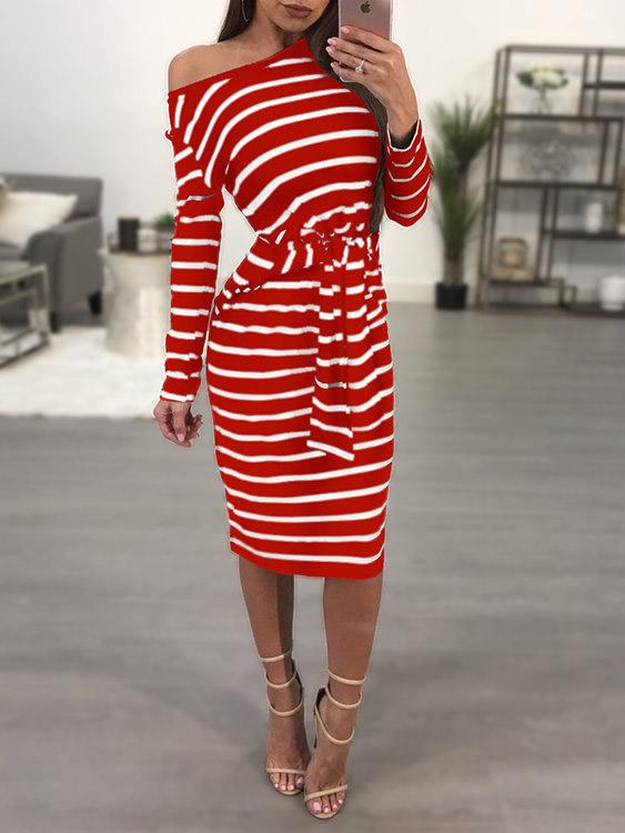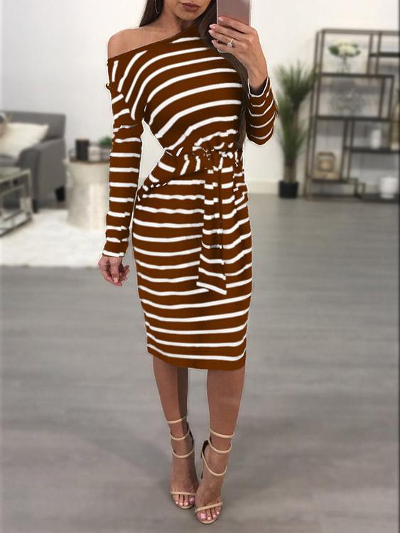 Asymmetrical One Shoulder Long Sleeve Stripe Midi Dress