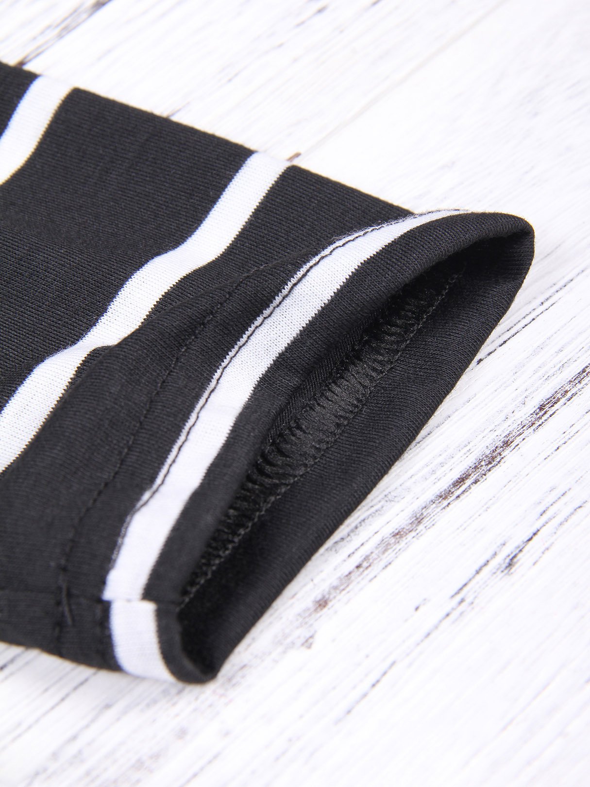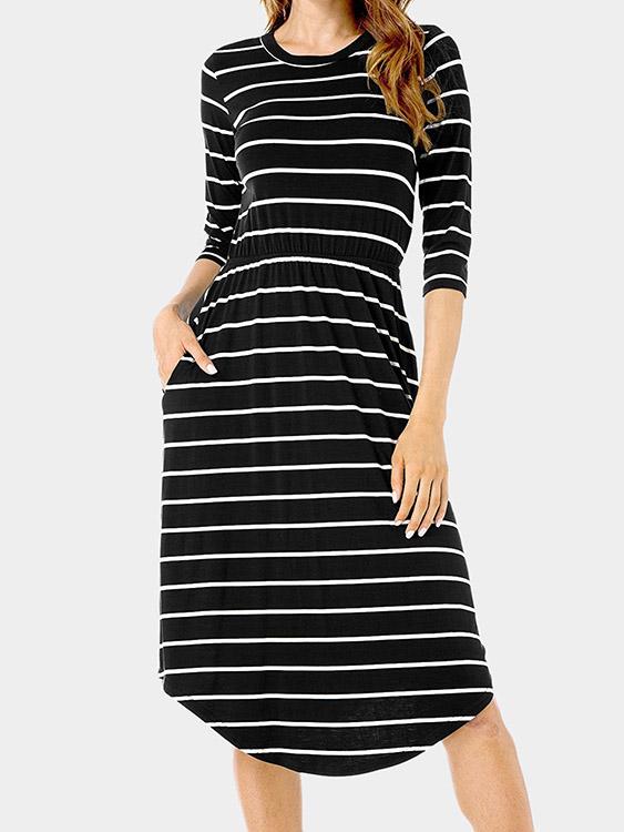 Black Round Neck 3/4 Length Sleeve Stripe Curved Hem Midi Dress