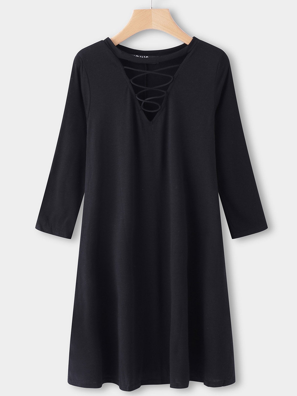 Black Round Neck 3/4 Sleeve Length Plain Side Pockets Lace-Up Midi Dress