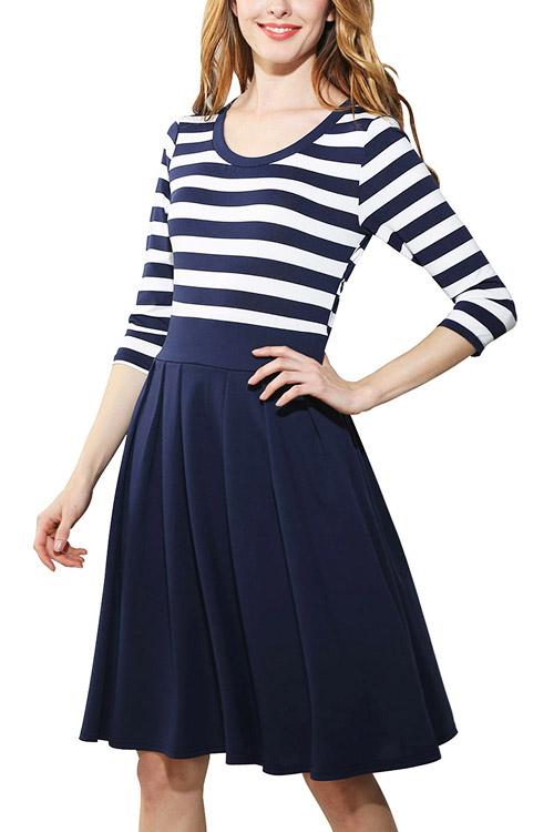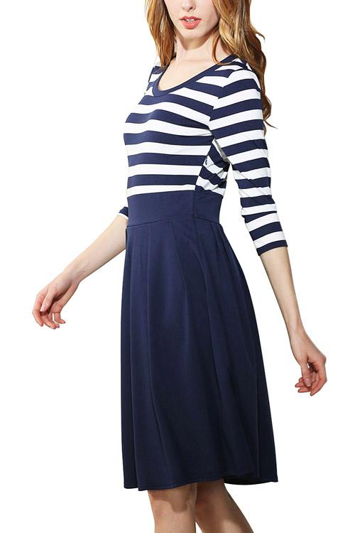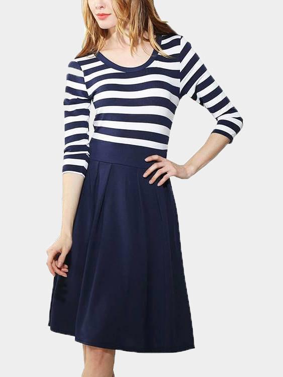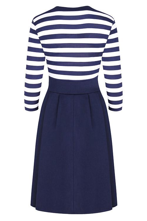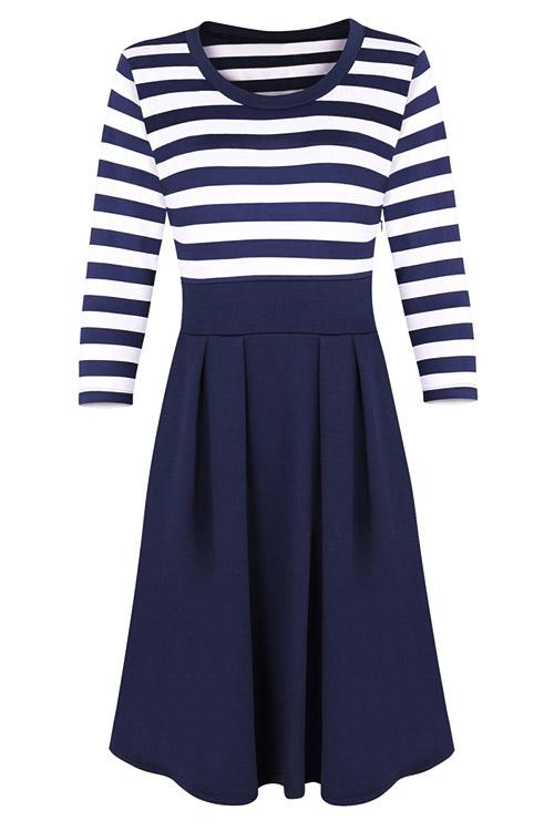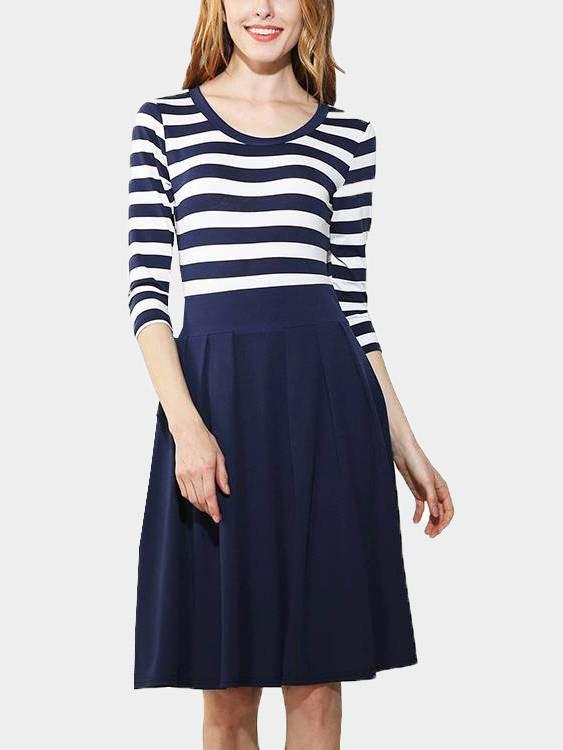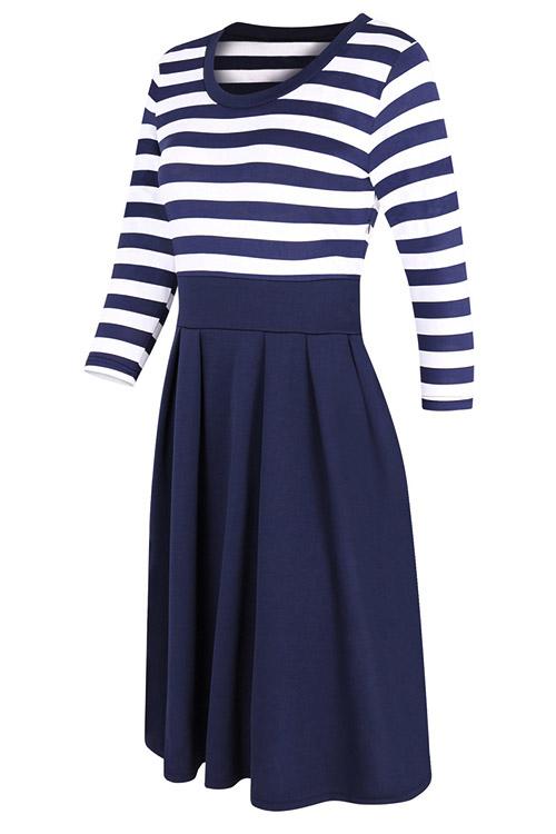 Blue Round Neck 3/4 Length Sleeve Stripe Midi Dress