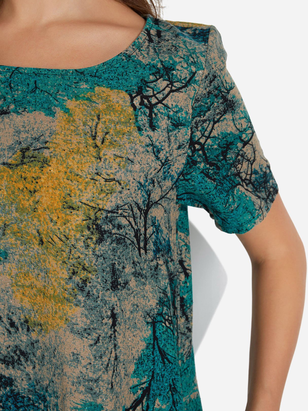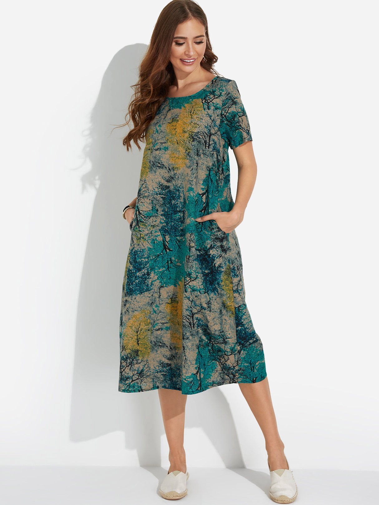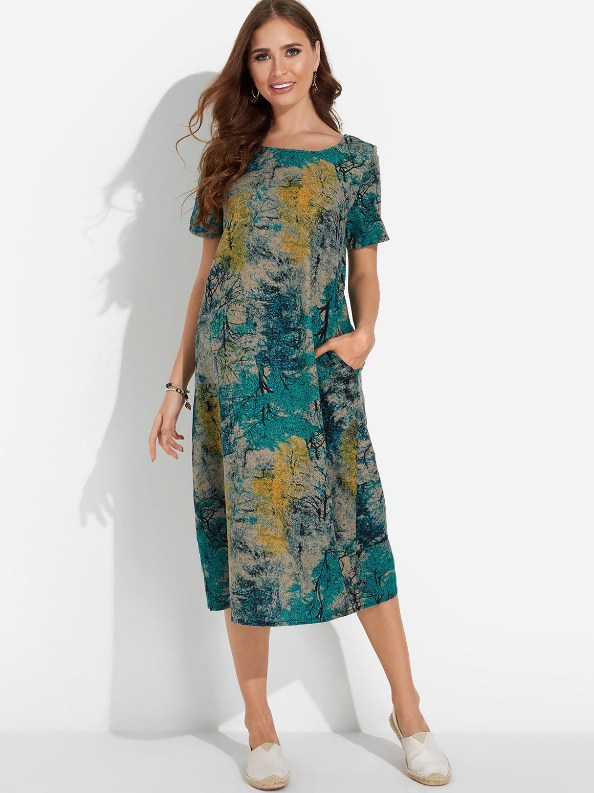 Blue Round Neck Short Sleeve Floral Print Midi Dress