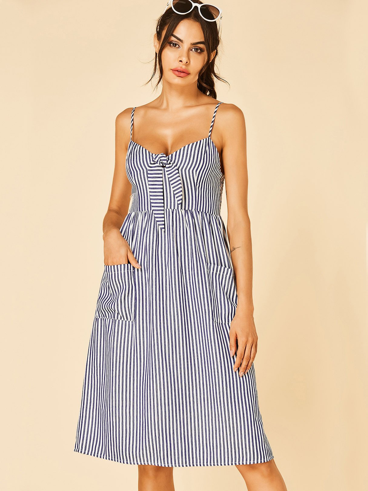 Blue V-Neck Sleeveless Stripe Backless High-Waisted Midi Dresses
