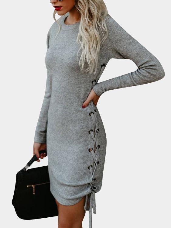 Grey Crew Neck Long Sleeve Plain Lace-Up Midi Dress