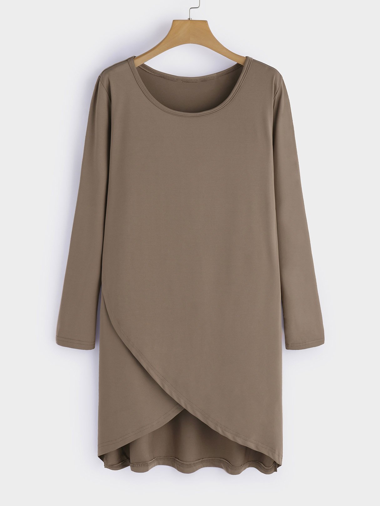 Khaki Round Neck Long Sleeve Plain Crossed Front Midi Dress