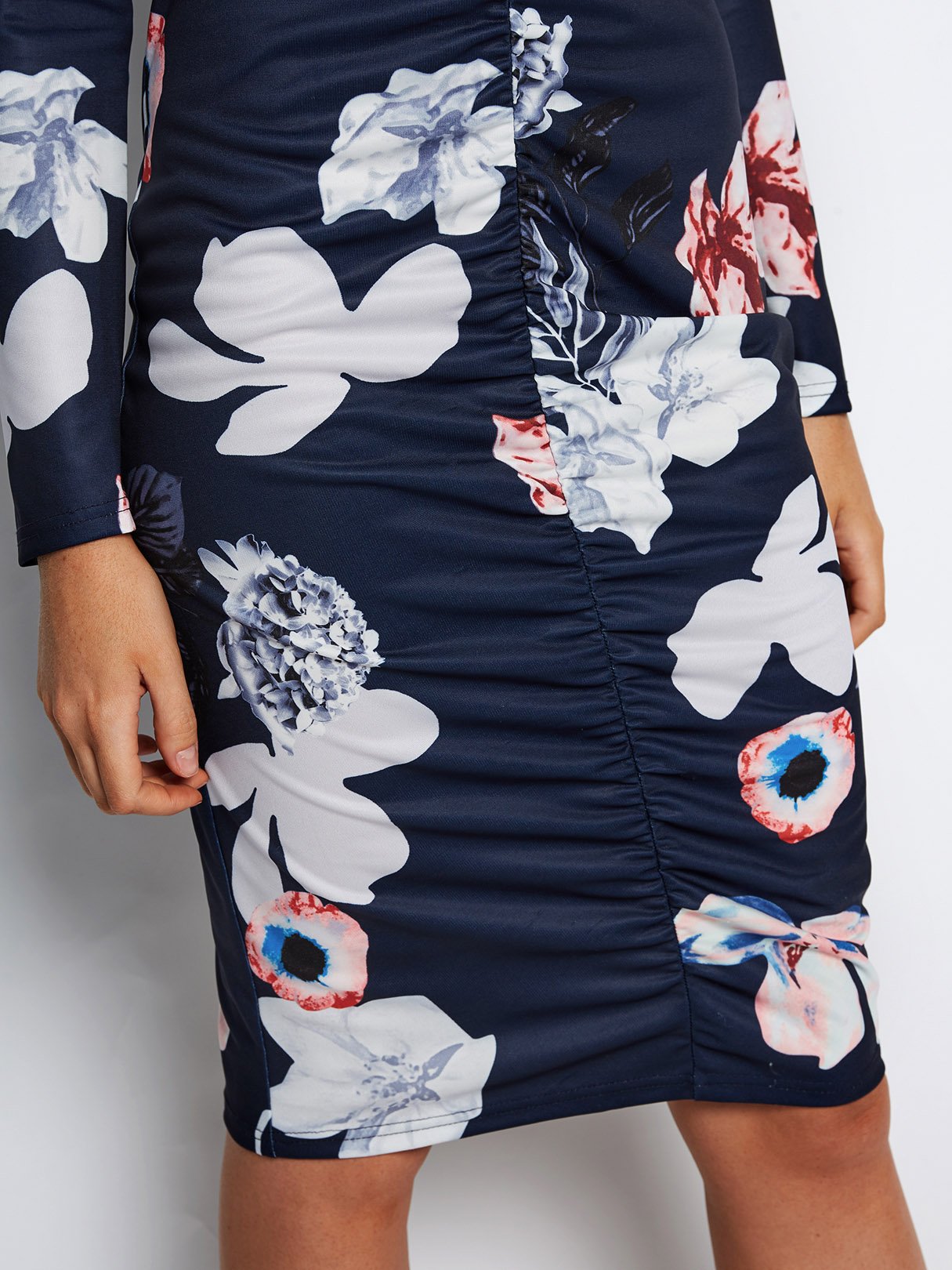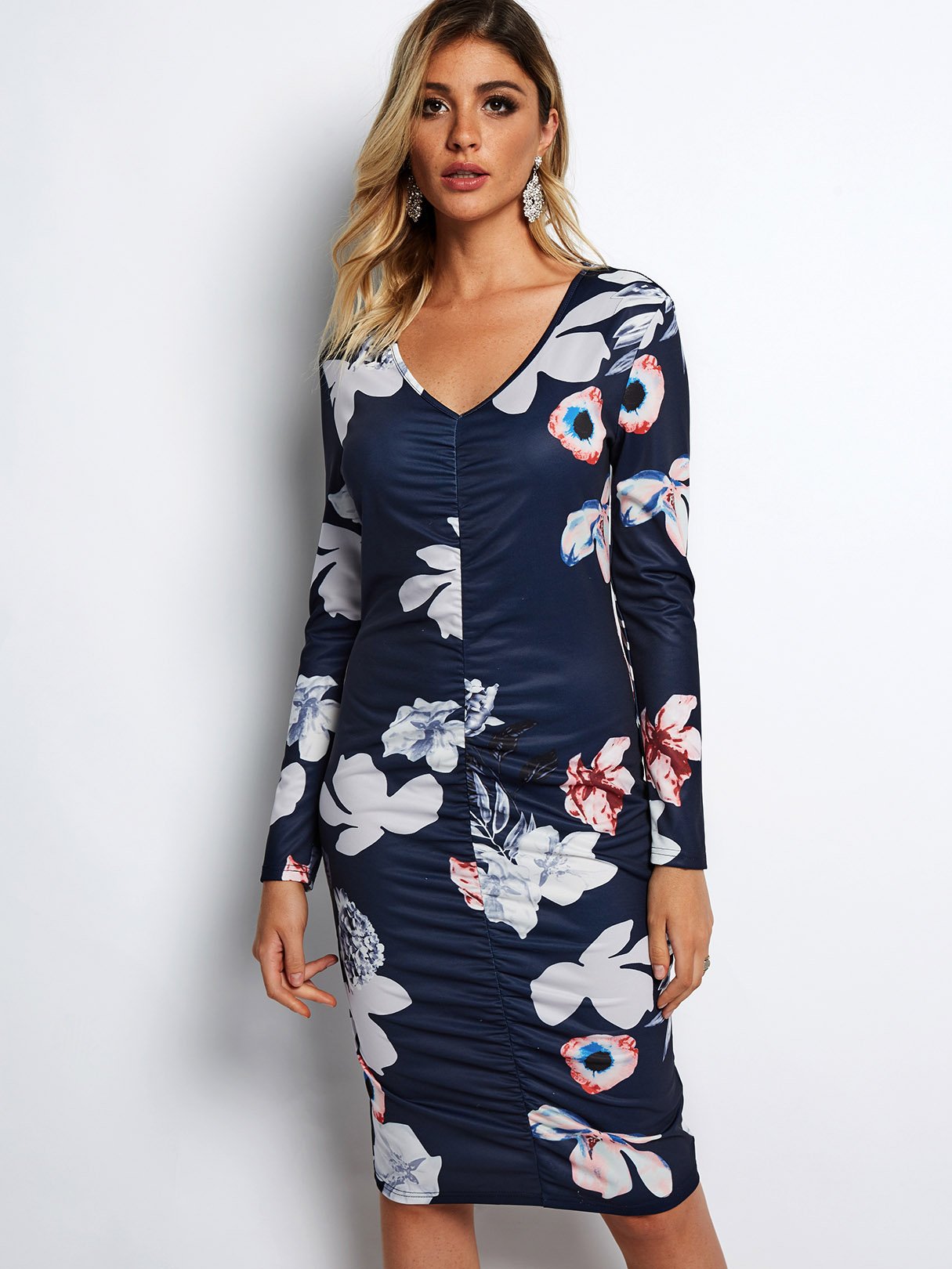 Material:Polyester,SpandexNeckline:V-NeckSeason:Autumn,WinterSleeves:Long SleevesPattern:Floral PrintStyle:Vacation StyleDetail:Pleated DesignLength:MidiFit:Bodycon Fit
