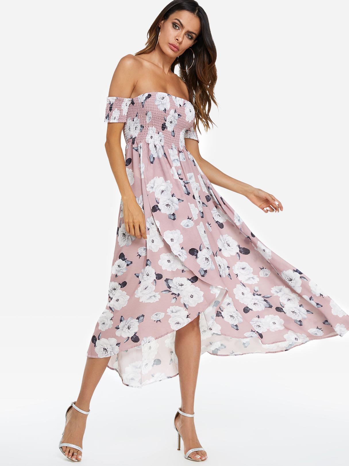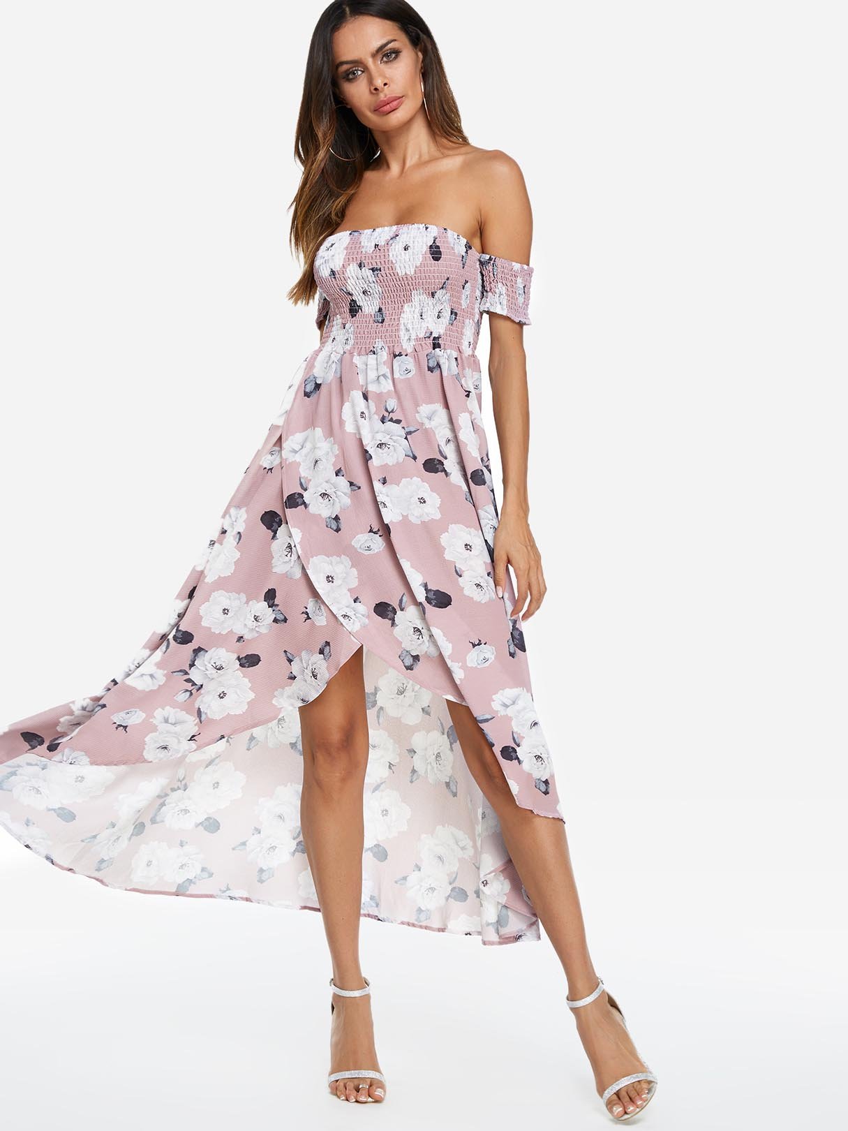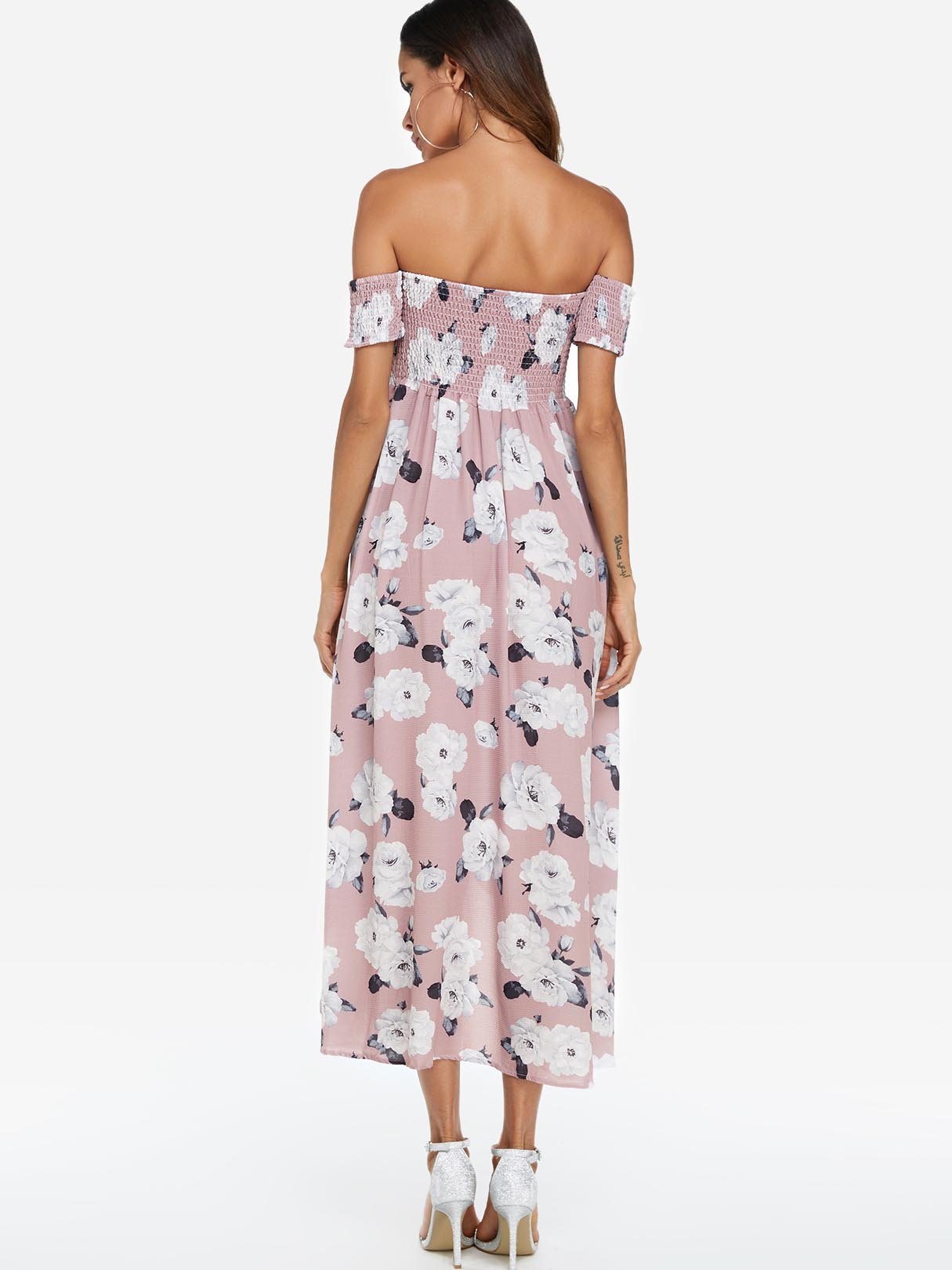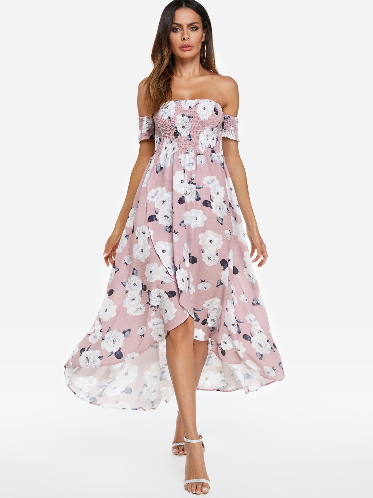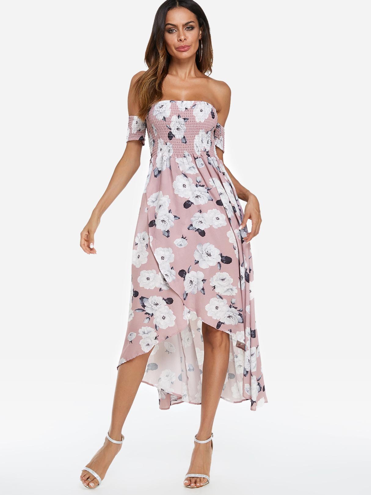 Material:Polyester,OtherNeckline:BateauSeason:Spring,SummerSleeves:Short SleevesPattern:Floral PrintStyle:Vacation Style,Sexy StyleDetail:Backless Design,Pleated DesignWaist Design:High-WaistedHem Design:Irregular HemLength:MidiFit:Regular FitOccasion:Wedding Guest