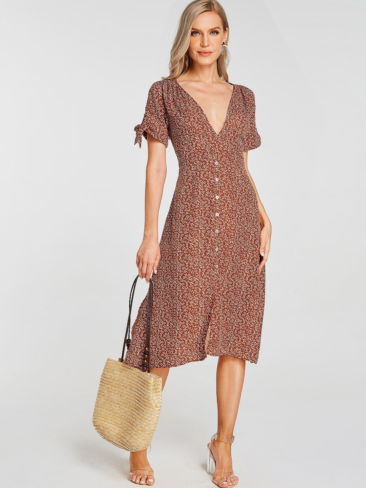 Material:PolyesterNeckline:V-NeckSeason:Spring,SummerSleeves:Short SleevesStyle:Casual StyleDetail:Slit DesignHem Design:Slit HemLength:MidiFit:Regular FitSleeves Type:Tie-Up At CuffsOccasion:Vacation