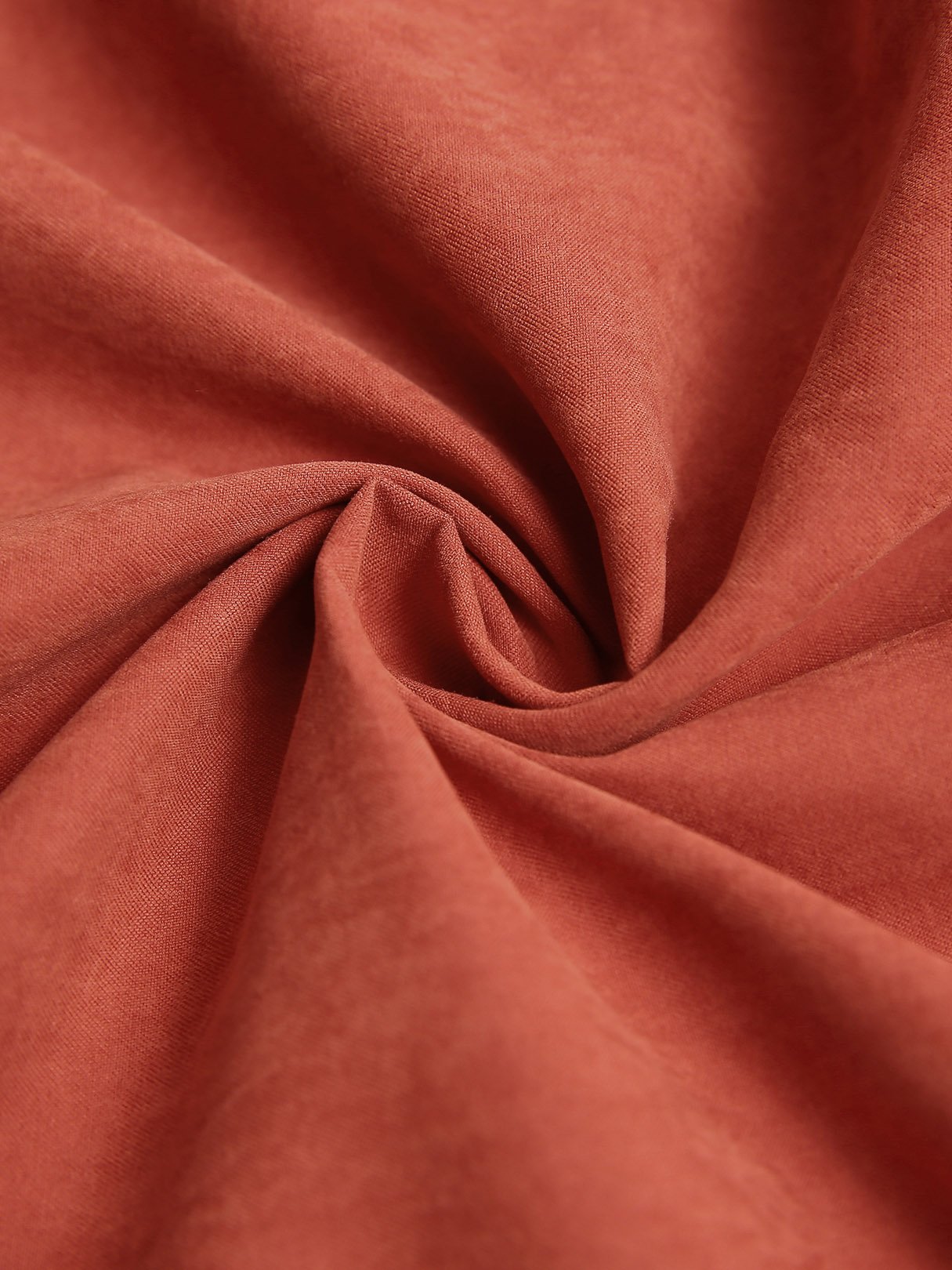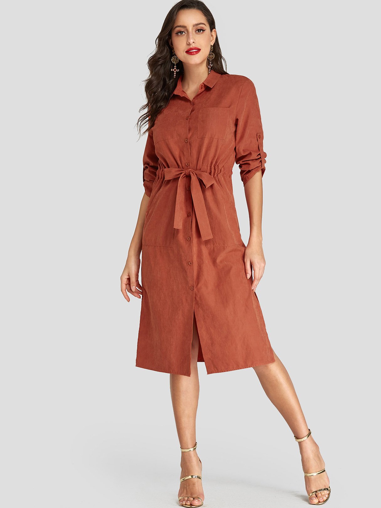 Rust Classic Collar Half Sleeve Plain Pleated Belt Self-Tie Slit Hem Midi Dresses