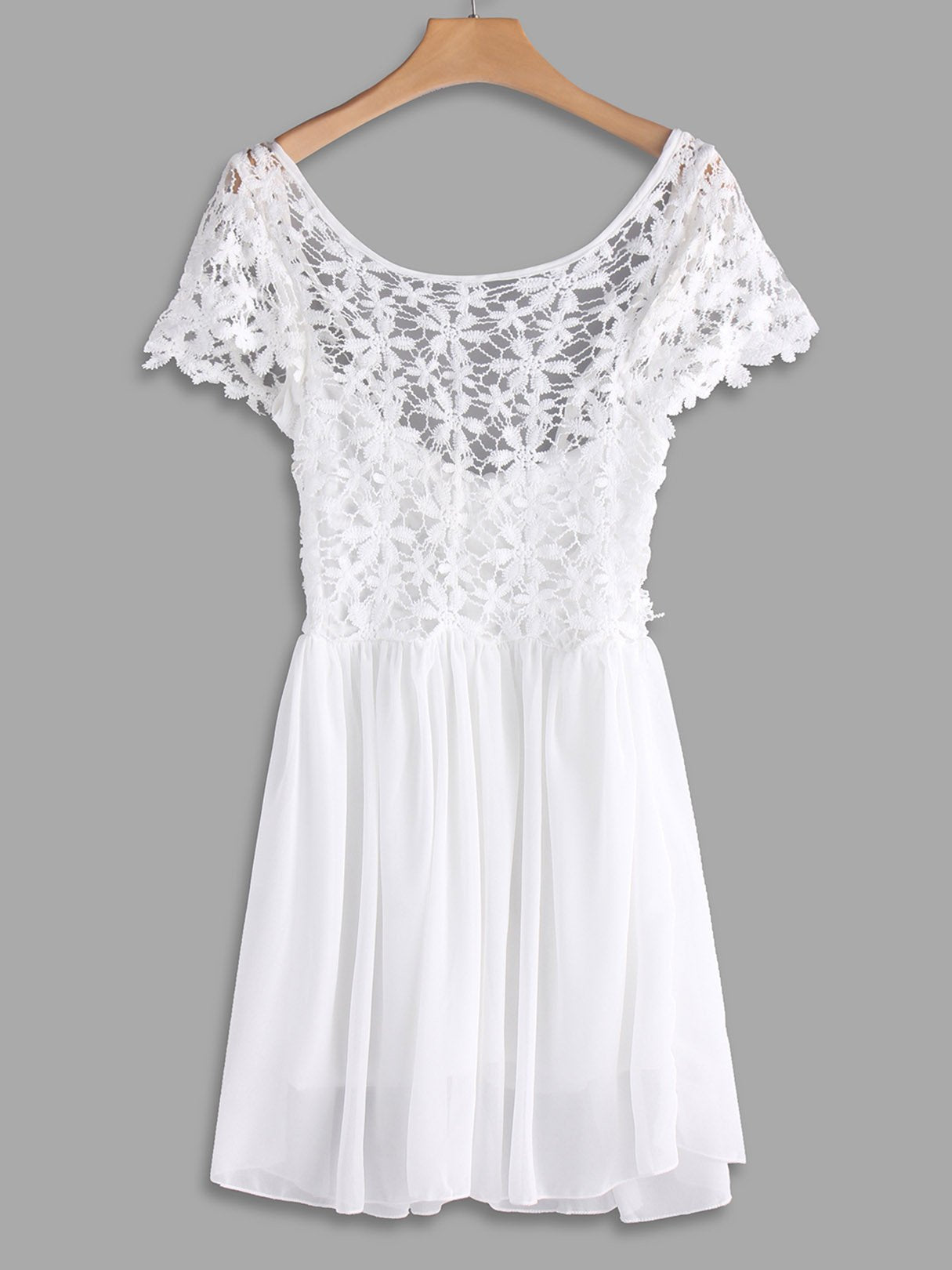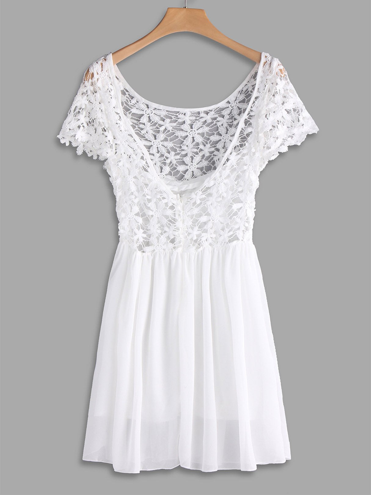 White Round Neck Short Sleeve Plain Lace Zip Back Backless Midi Dress