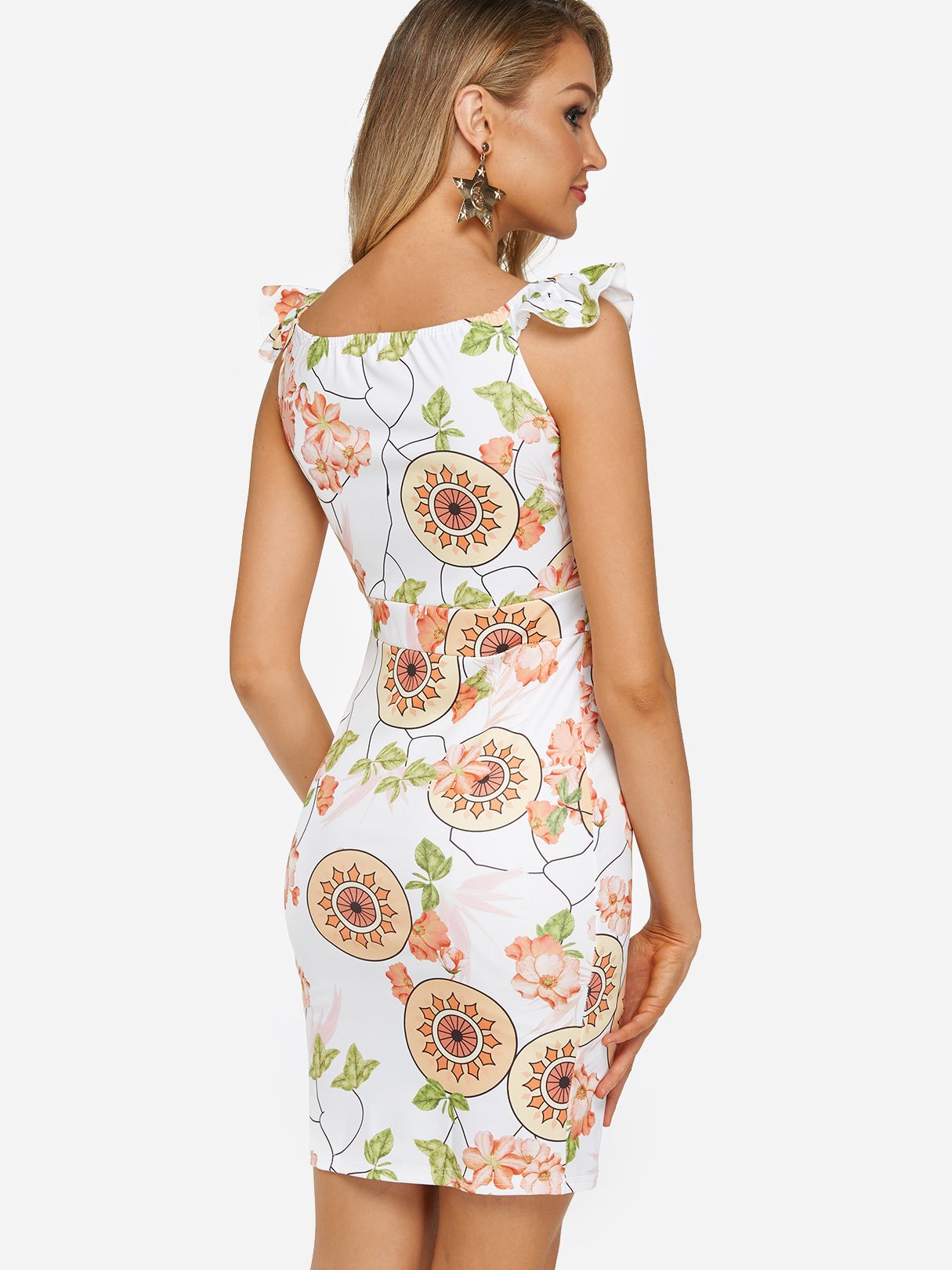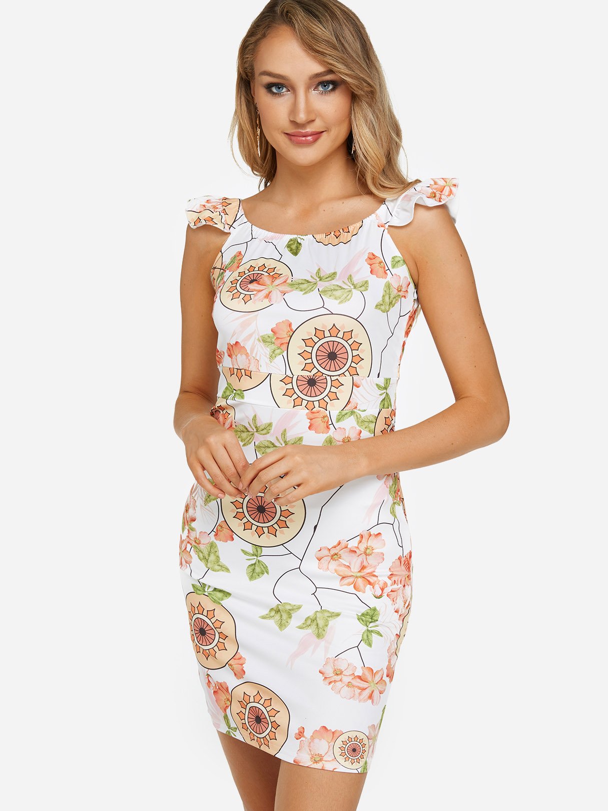 White Round Neck Sleeveless Floral Print Bodycon Dresses - White / S is backordered and will ship as soon as it is back in stock.
