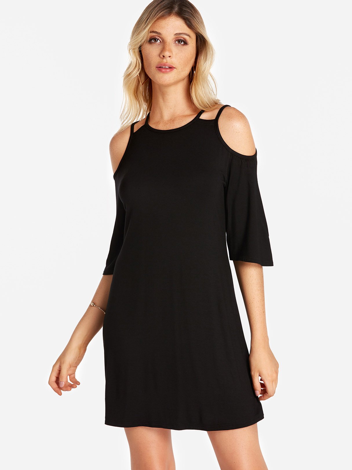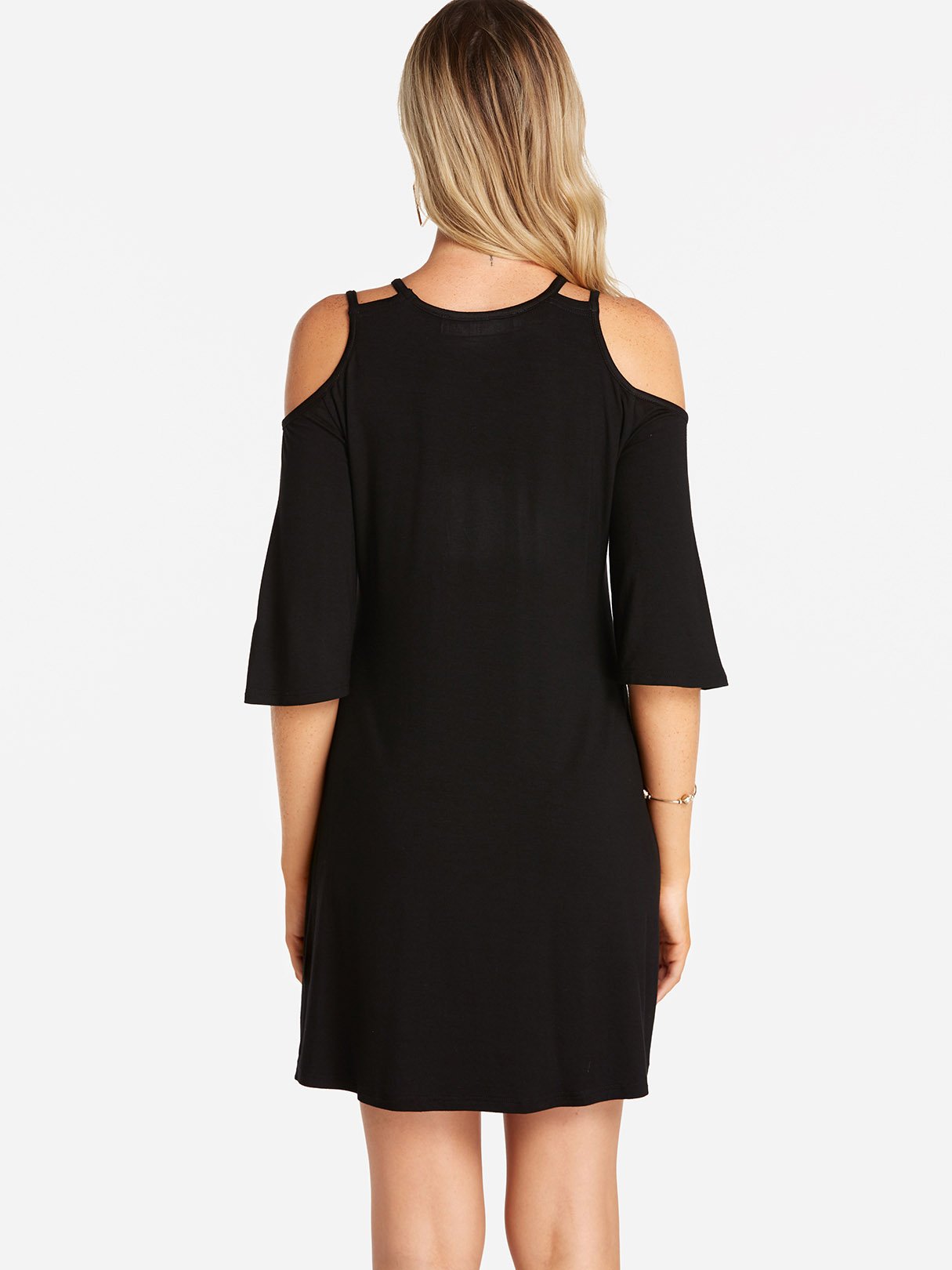 Black Cold Shoulder 3/4 Length Sleeve Plain Mini Dresses