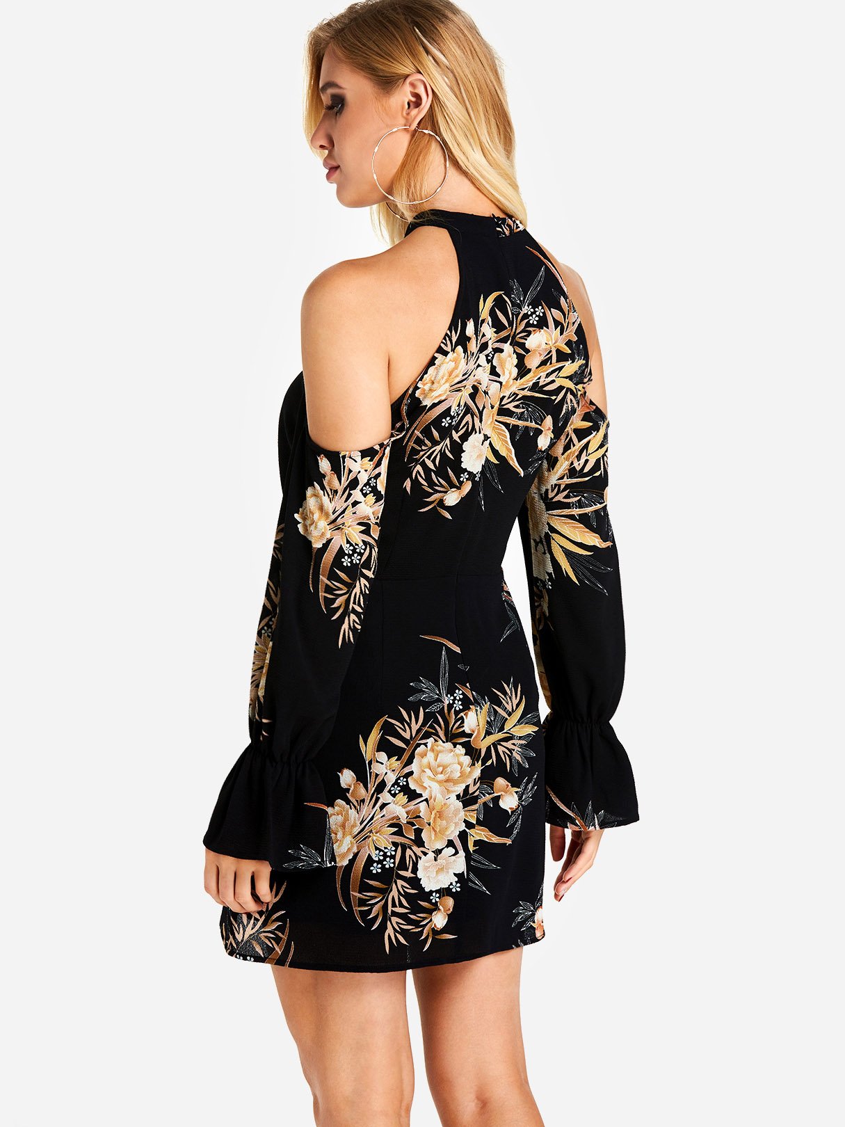 Black Cold Shoulder Long Sleeve Floral Print Mini Dress