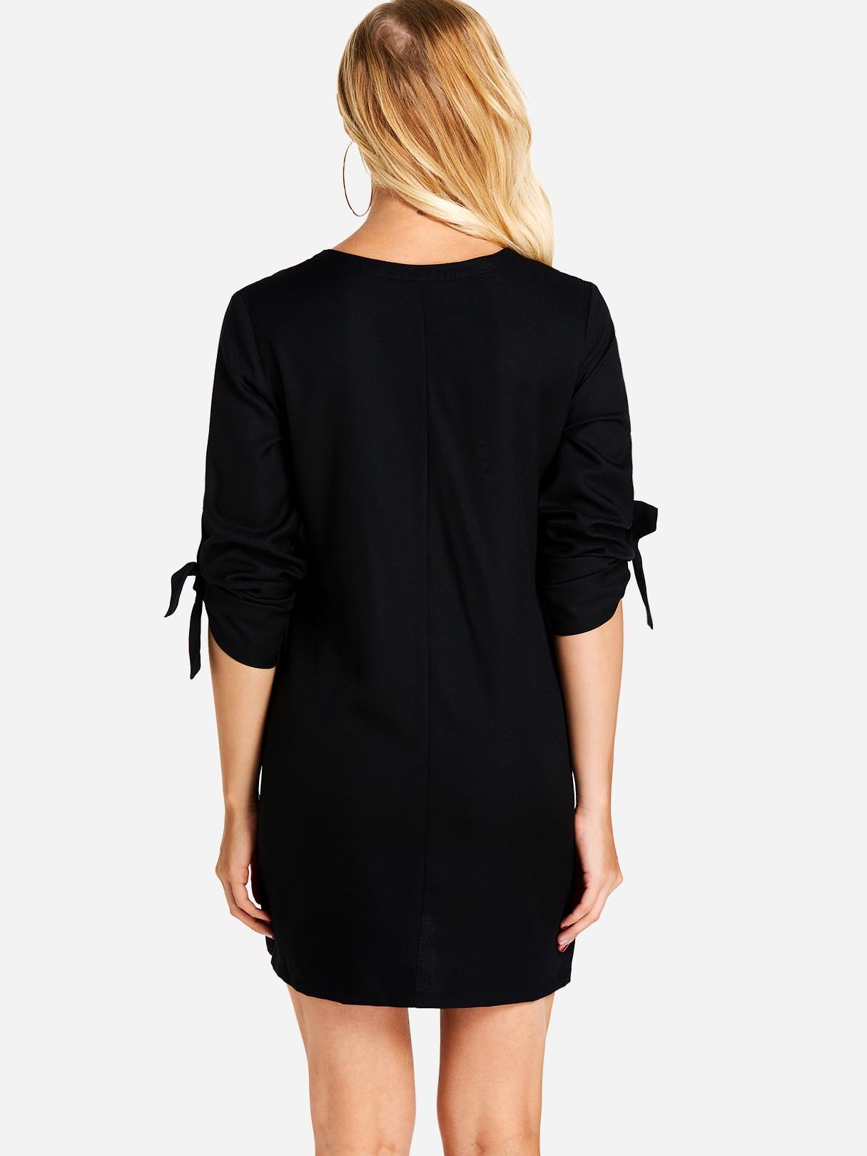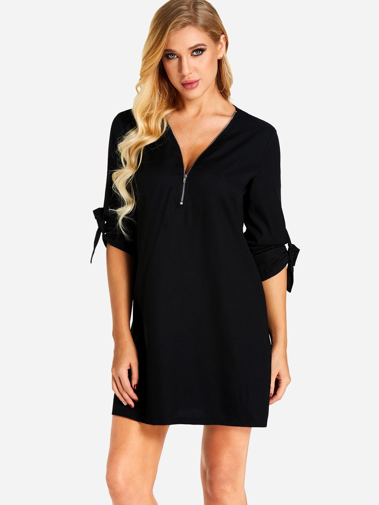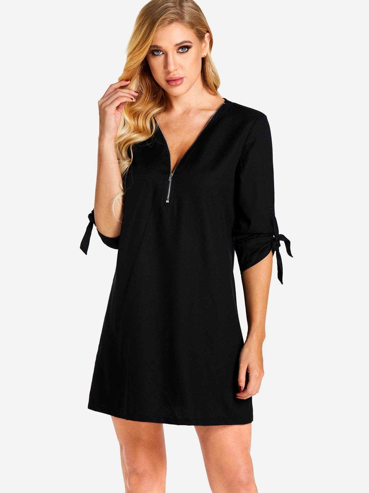 Black Half Sleeve Plain Zip Back Self-Tie Mini Dresses