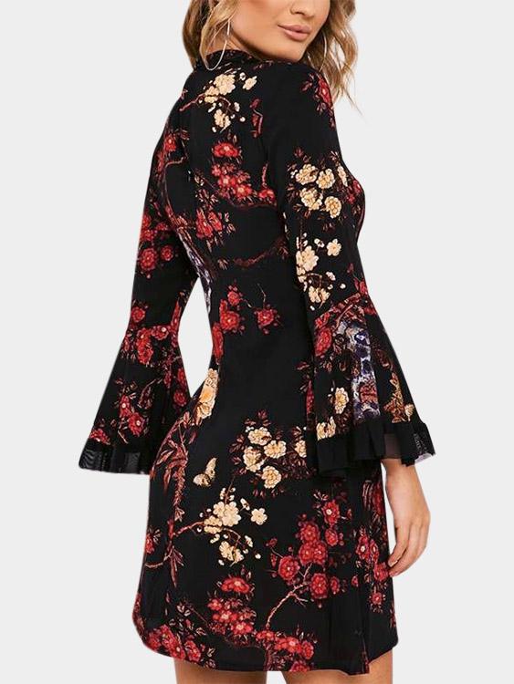 Material:PolyesterNeckline:Perkins CollarSeason:Spring,Autumn,WinterSleeves:Long SleevesPattern:Floral PrintStyle:Casual StyleWaist Design:High-WaistedHem Design:Curved HemLength:MiniFit:Regular FitSleeves Type:Bell Sleeves