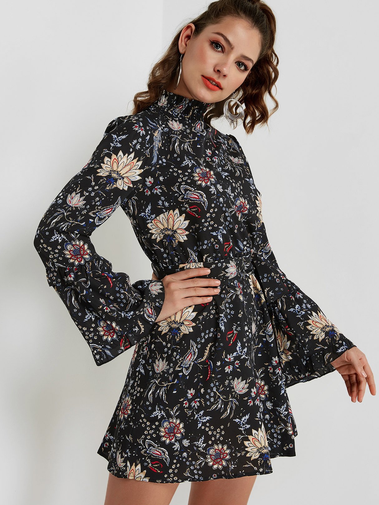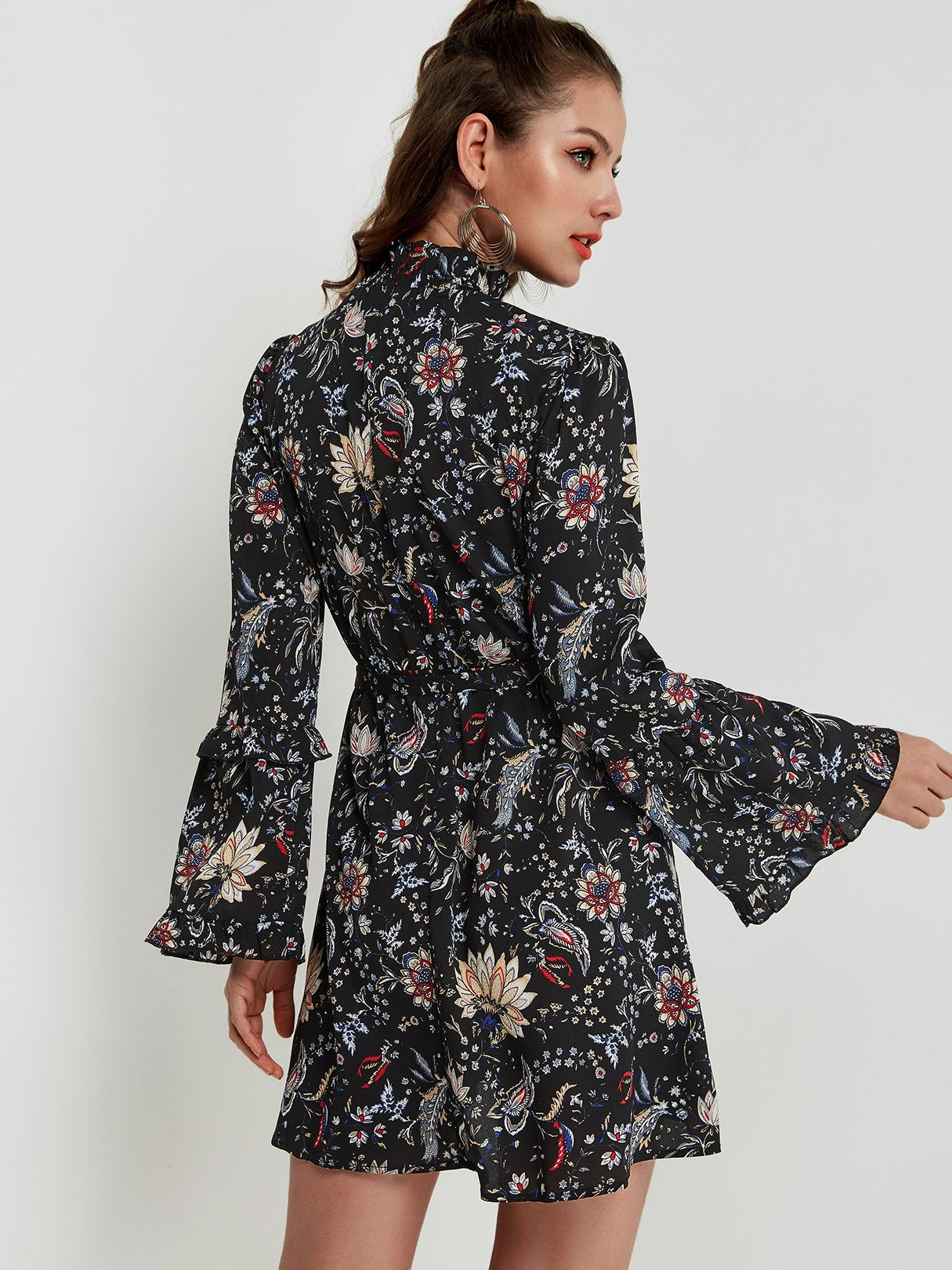 Material:PolyesterNeckline:Perkins CollarSeason:Spring,Autumn,WinterSleeves:Long SleevesPattern:Floral PrintStyle:Ladies Style,Casual StyleDetail:Tiered Design,Lace-Up DesignWaist Design:High-WaistedLength:MiniFit:Regular Fit