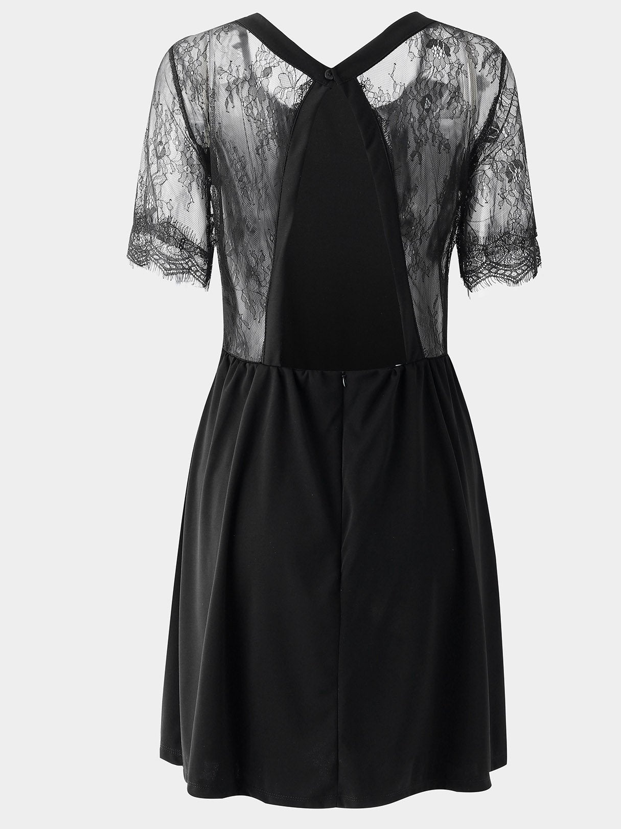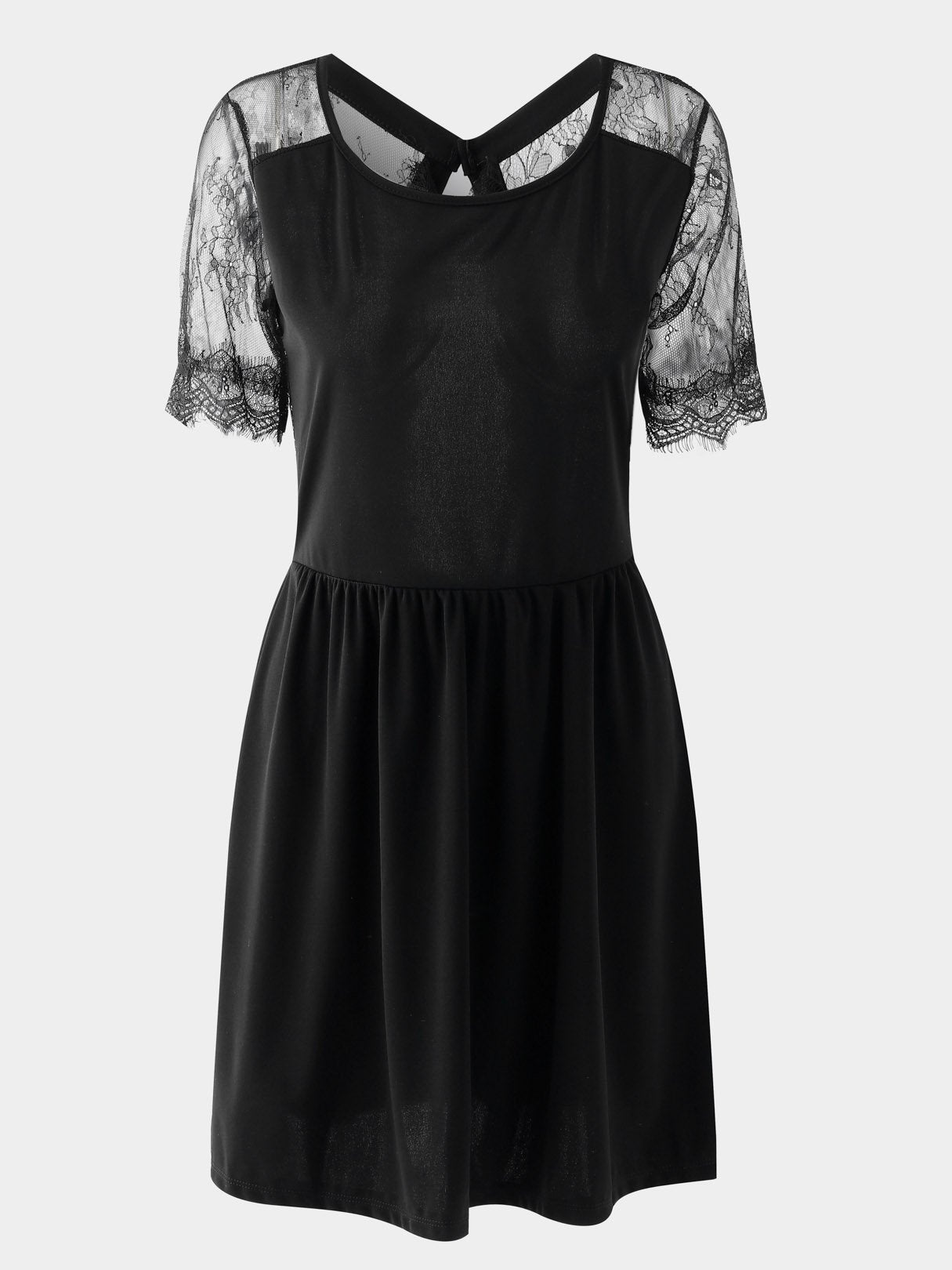 Black Round Neck Short Sleeve Plain Crochet Lace Embellished Cut Out See Through Mini Dress