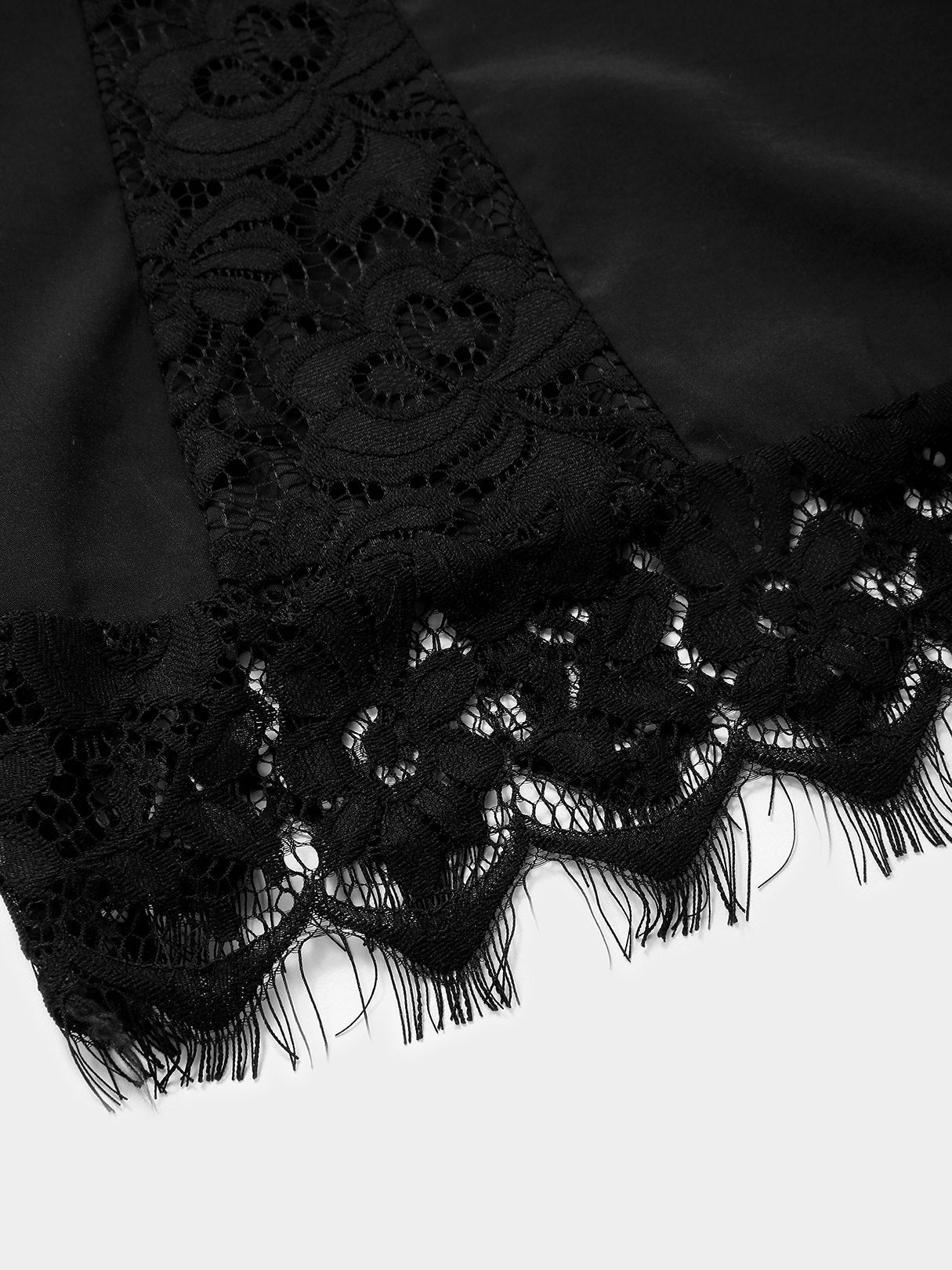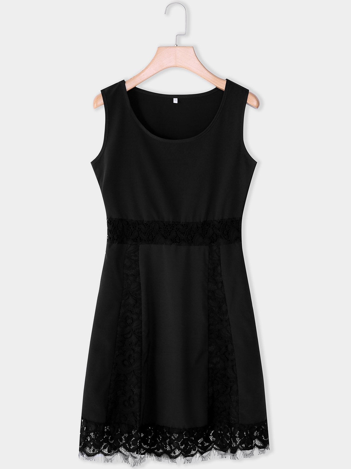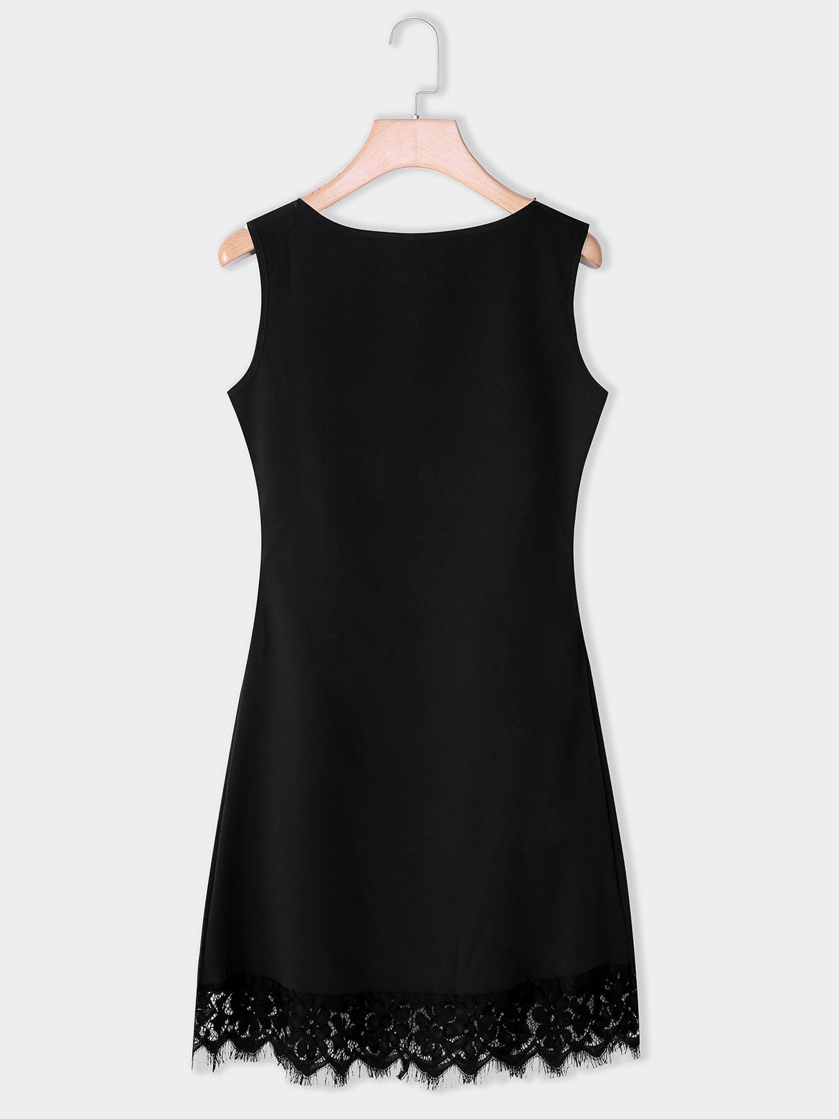 Black Round Neck Sleeveless Plain Lace Hollow Tassel Hem Mini Dress