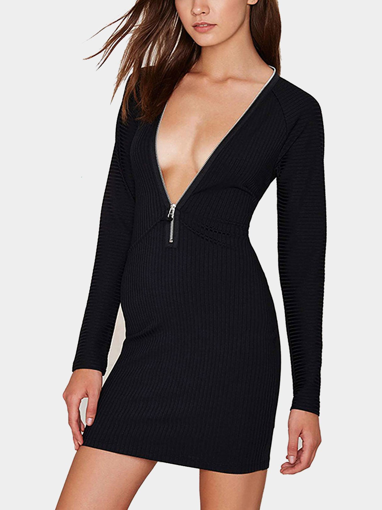 Black V-Neck Long Sleeve Zip Back Mini Dress