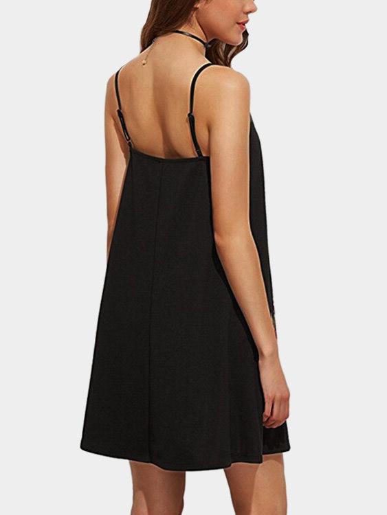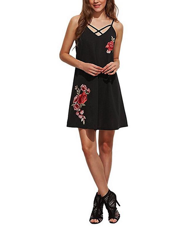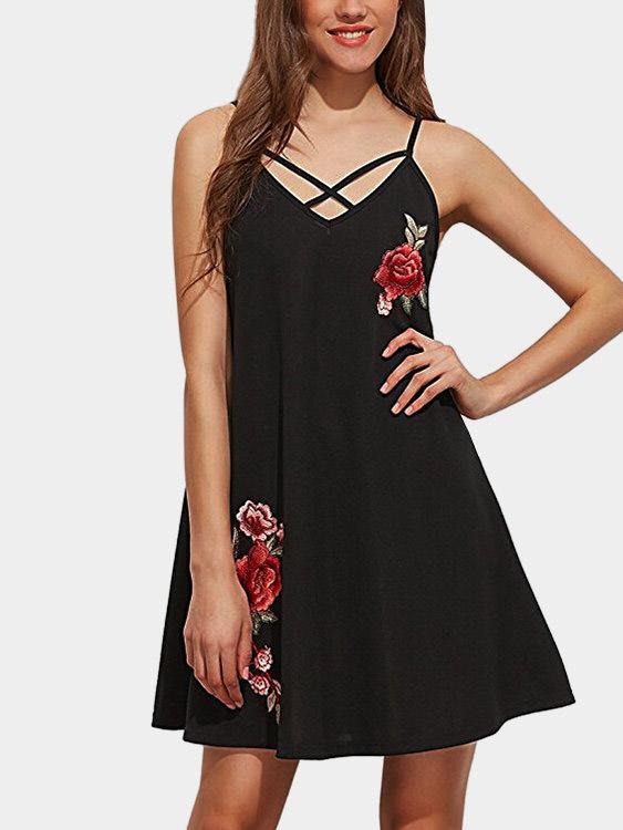 Black V-Neck Sleeveless Embroidered Mini Dresses