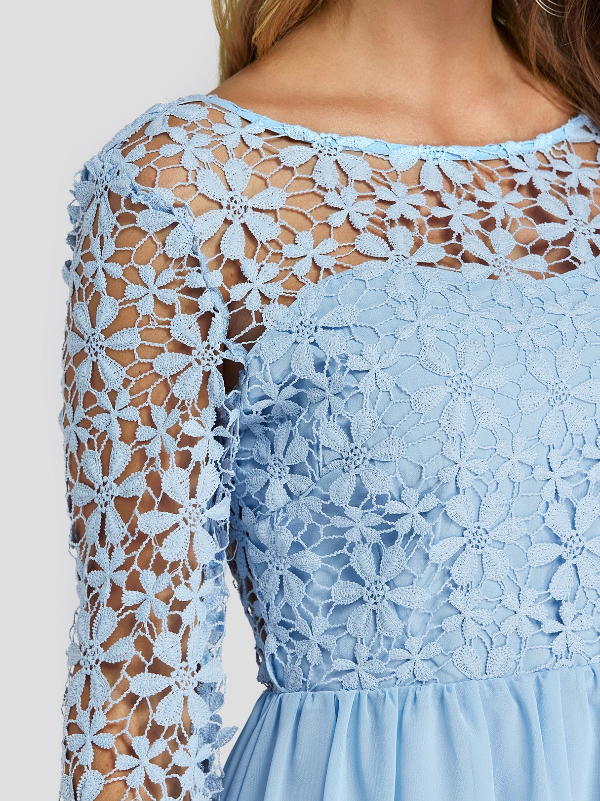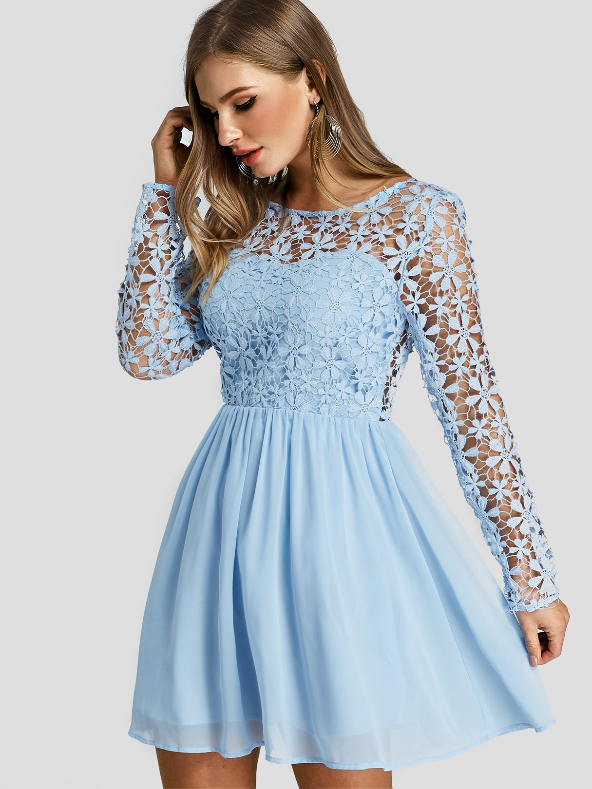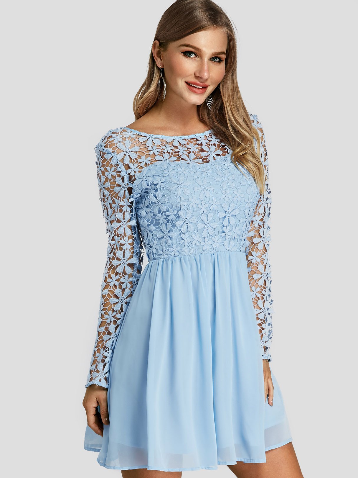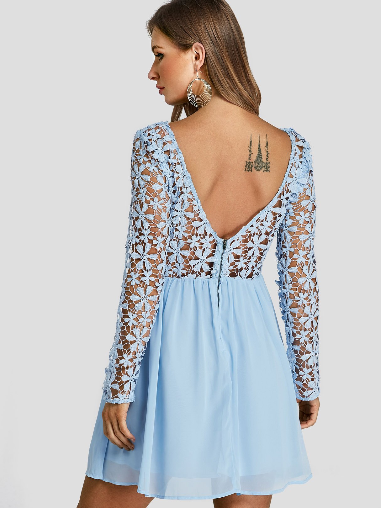 Blue Crew Neck Long Sleeve Lace Zip Back Backless Mini Dresses