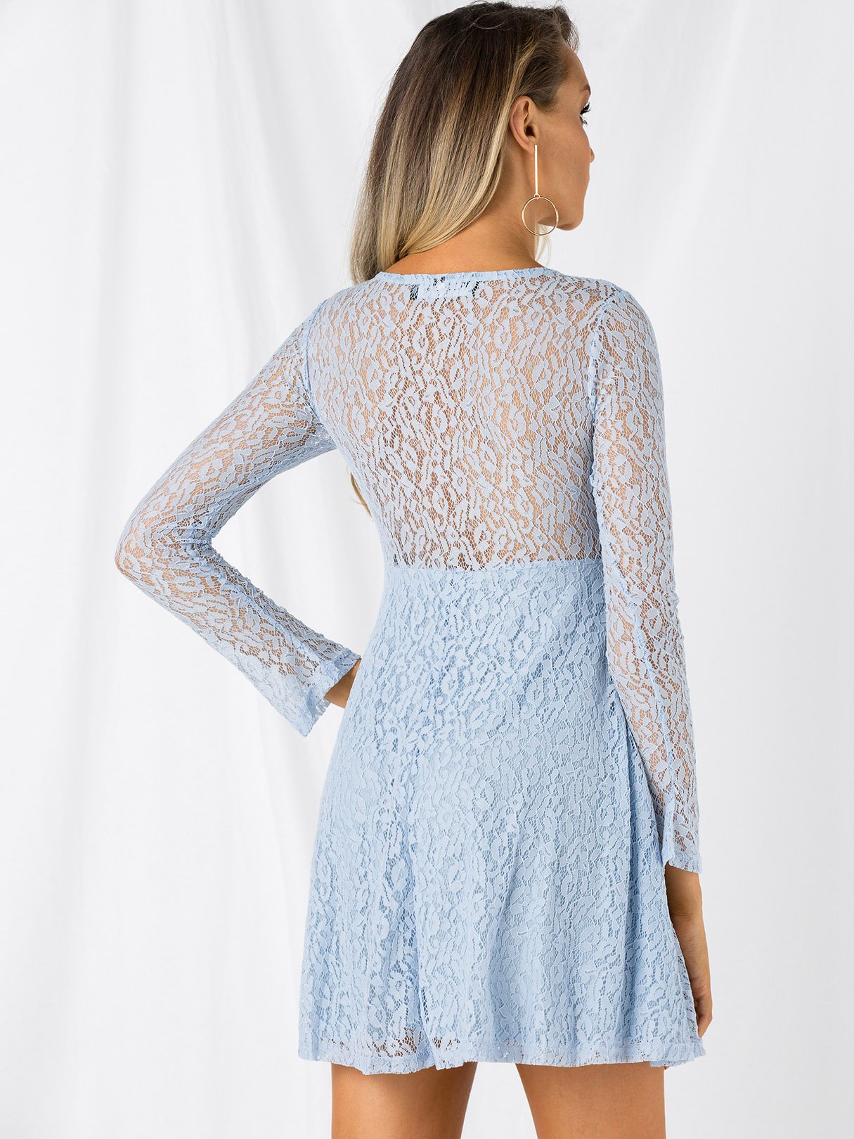 Blue Round Neck Long Sleeve Embroidered Cut Out See Through Mini Dress