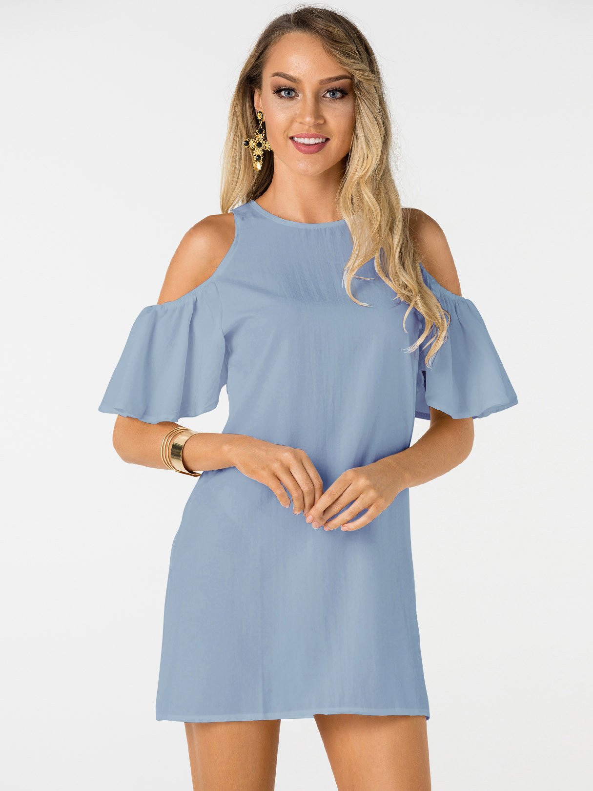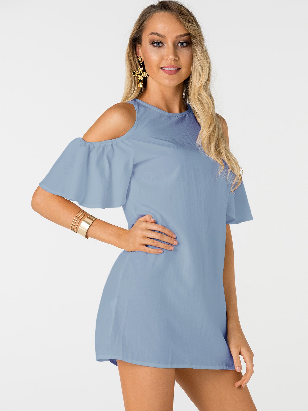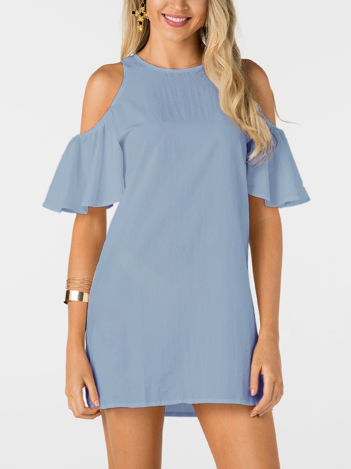 Blue Round Neck Short Sleeve Plain Zip Back Mini Dress