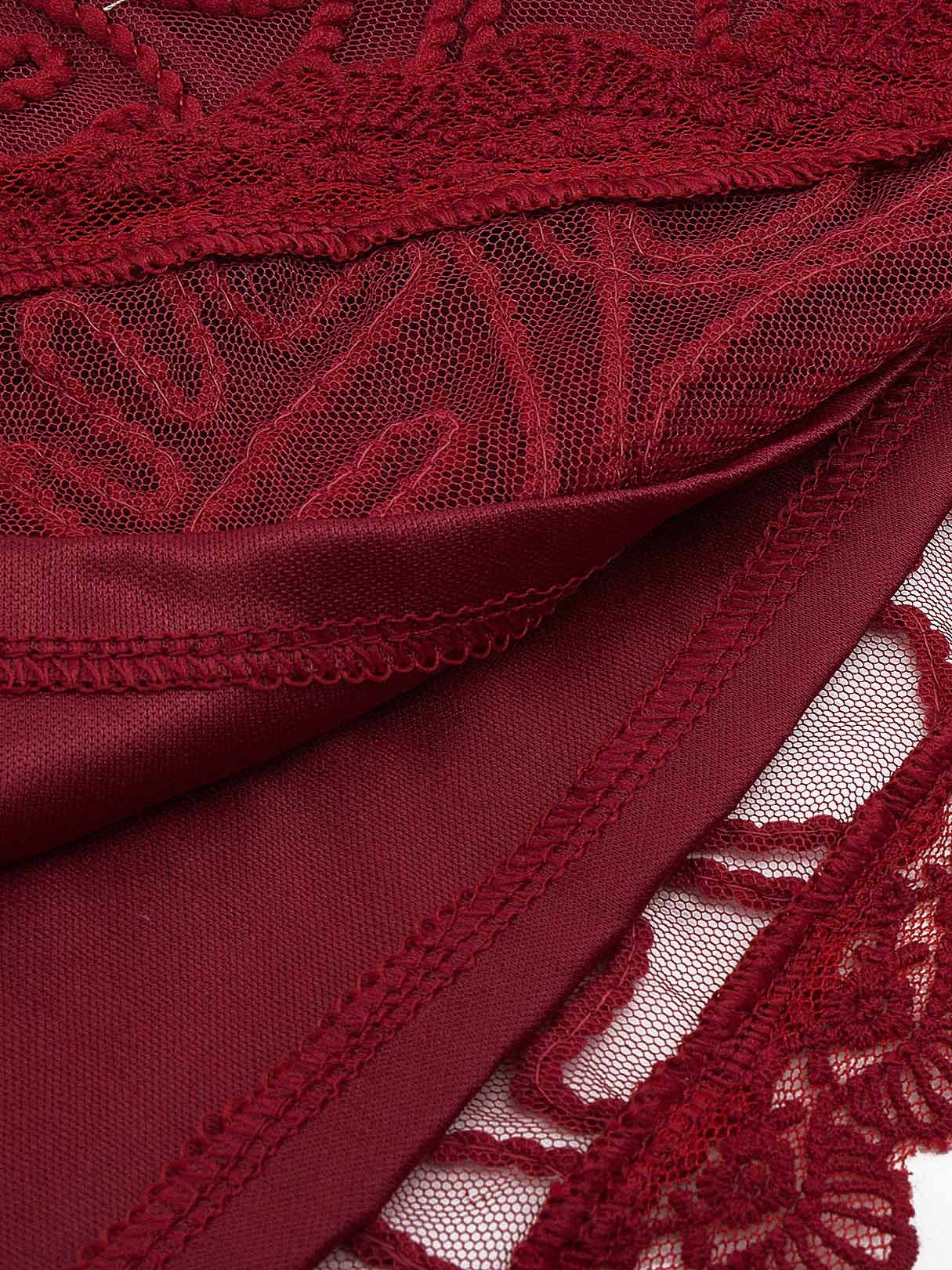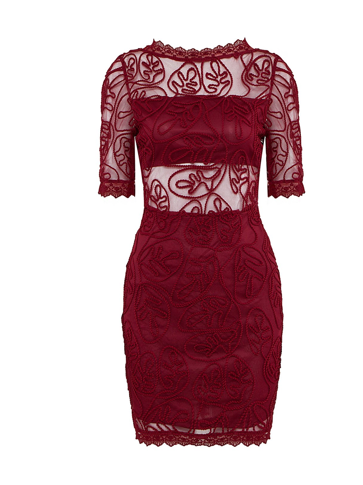 Burgundy Crew Neck Lace Zip Back Backless Mini Dress