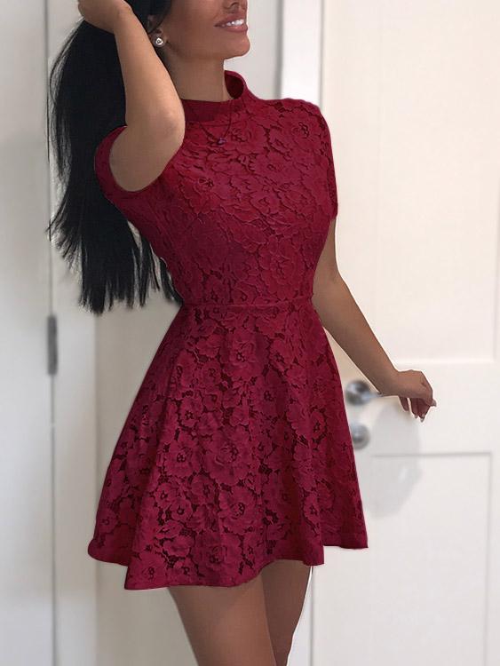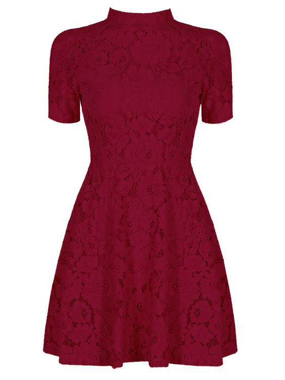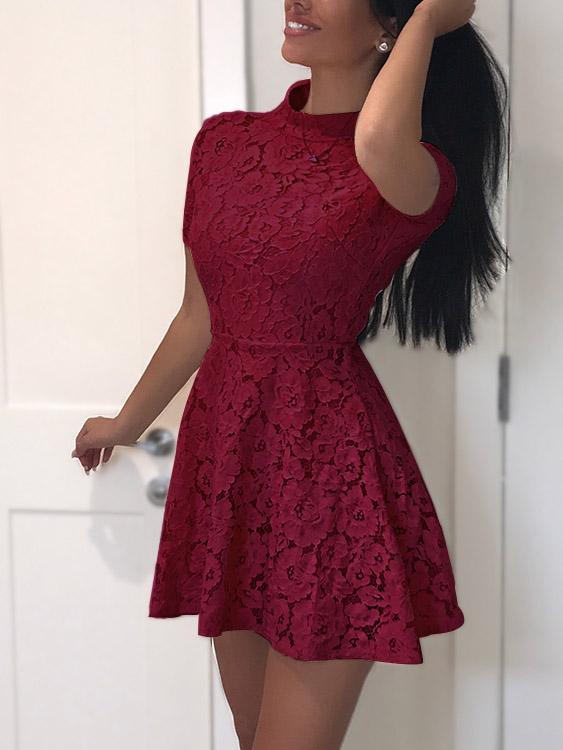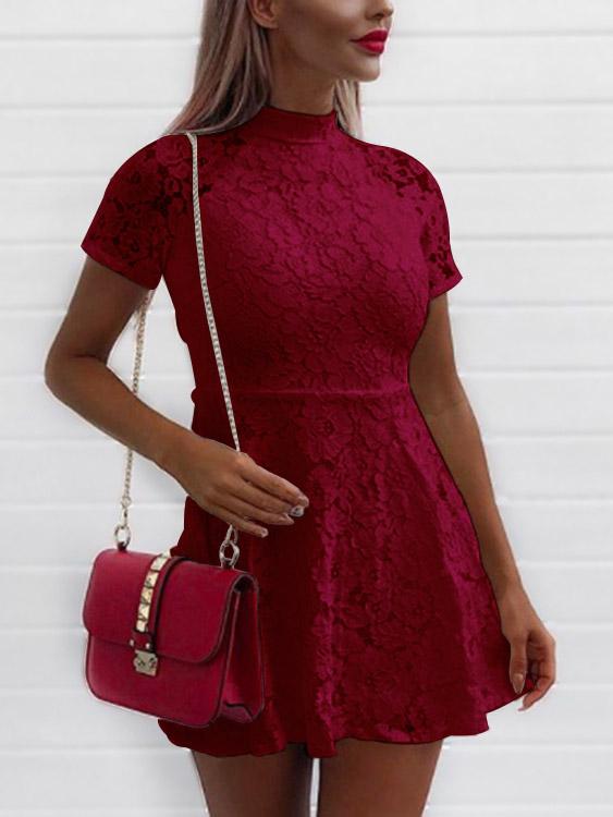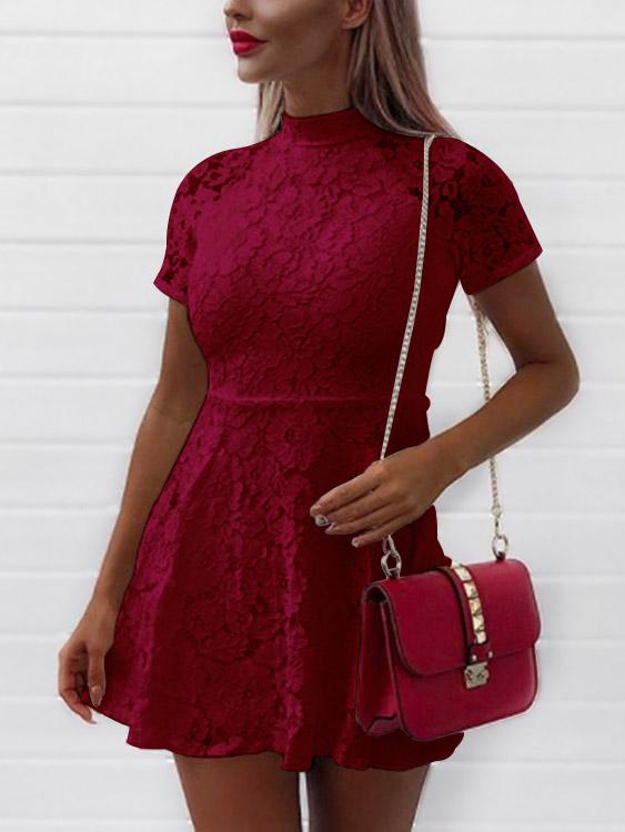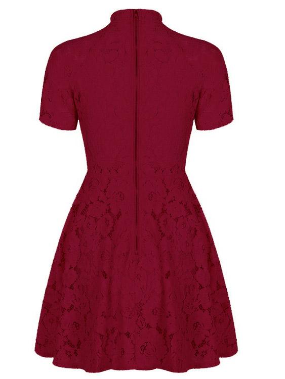 Burgundy Crew Neck Short Sleeve Lace Zip Back Mini Dresses