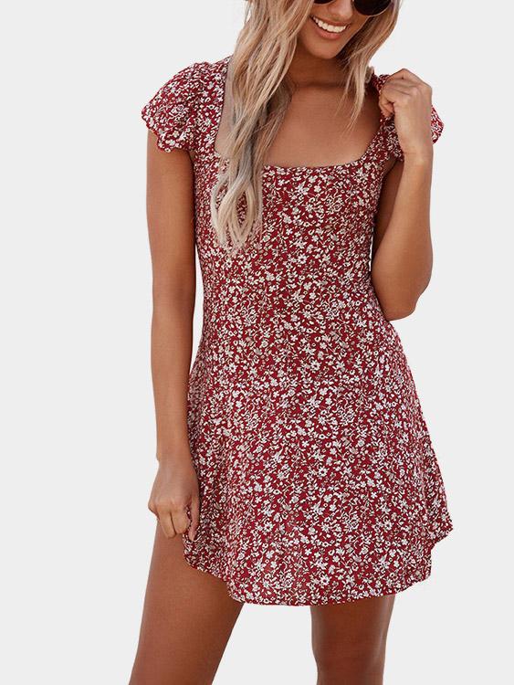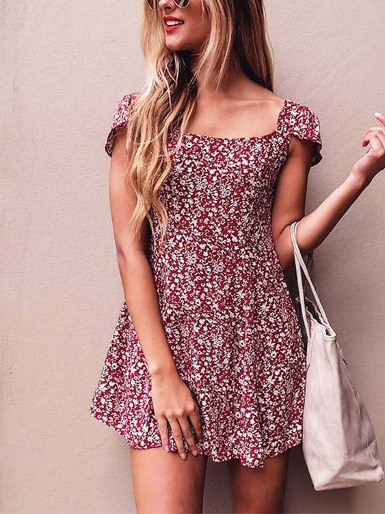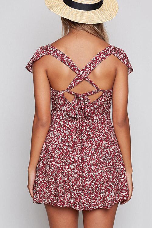 Burgundy Sleeveless Floral Print Lace-Up Mini Dresses