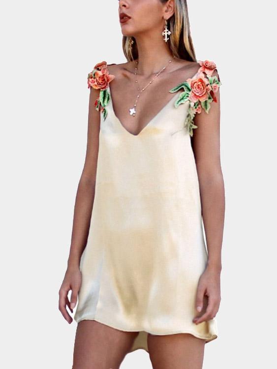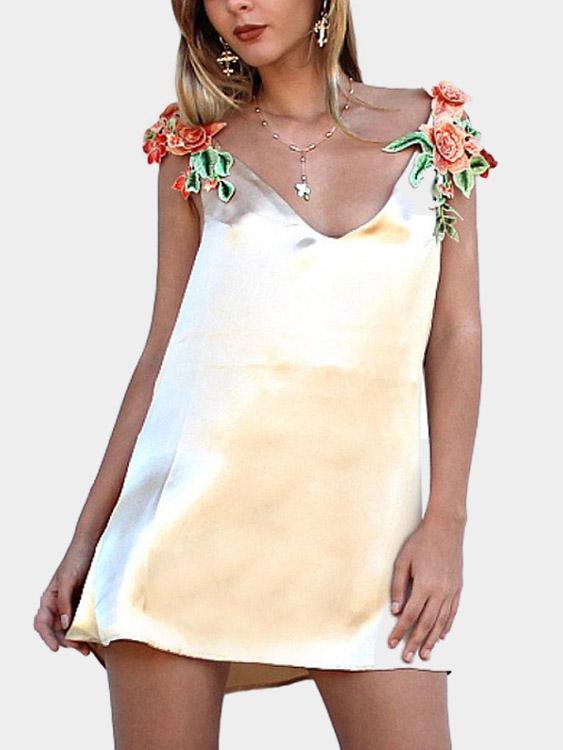 Material:PolyesterNeckline:V-NeckSeason:Spring,SummerSleeves:SleevelessPattern:EmbroideredStyle:Casual Style,Sexy StyleLength:MiniFit:Regular Fit